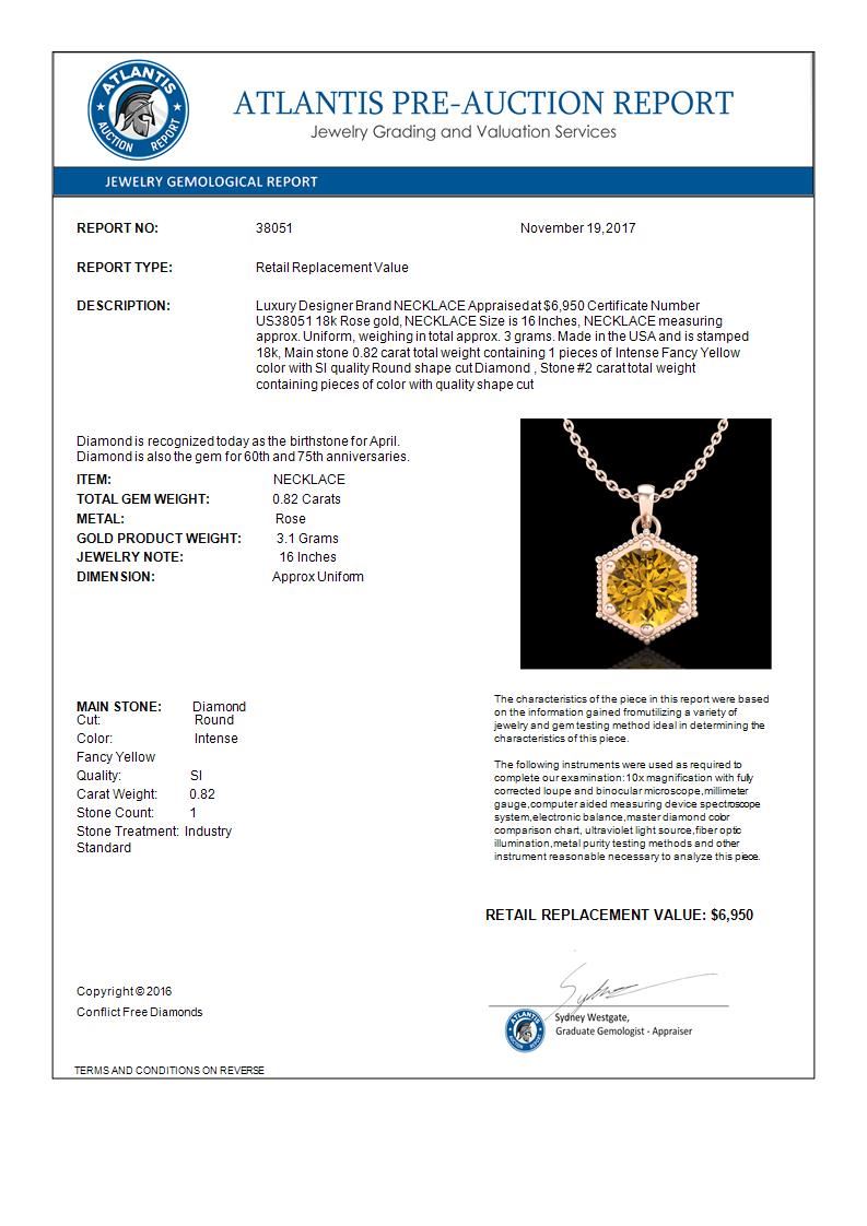 REF-114W5F -38051 ---- 0.82 CTW Intense Fancy Yellow Diamond Art Deco Stud Necklace 18K Rose Gold ---- Luxury Designer Brand NECKLACE Appraised at $6,950 Certificate Number US38051 18k Rose gold, NECKLACE Size is 16 Inches, NECKLACE measuring approx. Uniform, weighing in total approx. 3 grams. Made in the USA and is stamped 18k, Main stone 0.82 carat total weight containing 1 pieces of Intense Fancy Yellow color with SI quality Round shape cut Diamond , Stone #2 carat total weight containing pieces of color with quality shape cut