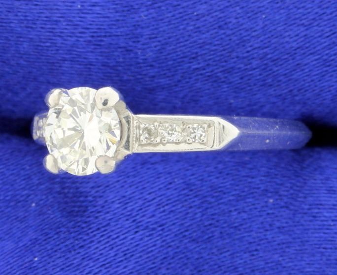 Gorgeous Platinum diamond ring. The center is a 0.82 carat round diamond with VS-2 clarity and I color. Set into the band are 6 single cut diamonds, 3 on either side of the center. Size 6 3/4" 3.6g