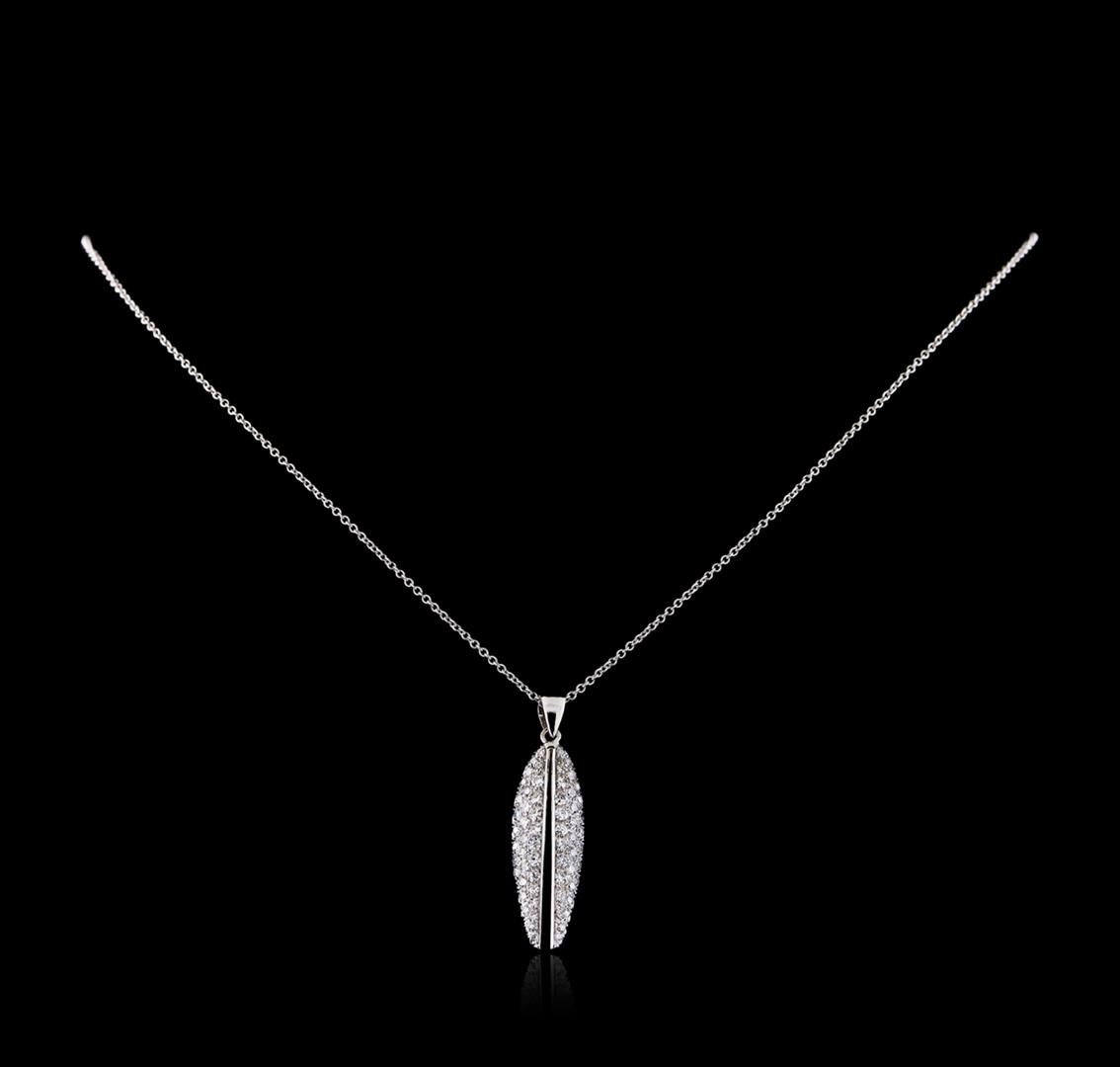 One electronically tested 14-18KT white gold ladies cast & assembled diamond pendant with chain. The pendant features a diamond set 18KT white gold leaf measuring one and one-half inches long completed by a 14KT white gold bail. The pendant is supported by an eighteen inch length 14KT white gold cable chain, terminating in a lobster claw clasp. Bright polish finish. Condition is new, good workmanship. Containing: Nineteen prong set single cut diamonds, measuring 1.80 - 1.70 x 1.05mm (depth est.) approximate total weight of 19 Stones = 0.40ct. Color & clarity grade are an average for the group. Graded in the setting. Clarity: VS-2 to SI-1. Color: F - H Forty-Five prong set single cut diamonds, measuring 1.50 - 1.20 x 0.81mm (depth est.) approximate total weight of 45 Stones = 0.42ct. Color & clarity grade are an average for the group. Graded in the setting. Clarity: VS-2 to SI-1. Color: F - H. Total Weight of Diamonds 0.82ct. Total Weight of Pendant With Chain 3.77gm. AIG Appraised at $2,845.00.