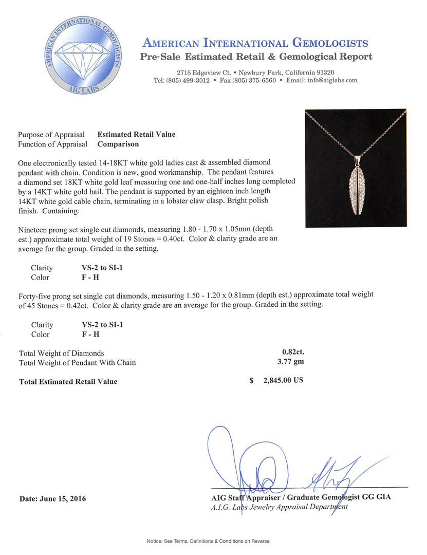 One electronically tested 14-18KT white gold ladies cast & assembled diamond pendant with chain. The pendant features a diamond set 18KT white gold leaf measuring one and one-half inches long completed by a 14KT white gold bail. The pendant is supported by an eighteen inch length 14KT white gold cable chain, terminating in a lobster claw clasp. Bright polish finish. Condition is new, good workmanship. Containing: Nineteen prong set single cut diamonds, measuring 1.80 - 1.70 x 1.05mm (depth est.) approximate total weight of 19 Stones = 0.40ct. Color & clarity grade are an average for the group. Graded in the setting. Clarity: VS-2 to SI-1. Color: F - H Forty-Five prong set single cut diamonds, measuring 1.50 - 1.20 x 0.81mm (depth est.) approximate total weight of 45 Stones = 0.42ct. Color & clarity grade are an average for the group. Graded in the setting. Clarity: VS-2 to SI-1. Color: F - H. Total Weight of Diamonds 0.82ct. Total Weight of Pendant With Chain 3.77gm. AIG Appraised at $2,845.00.
