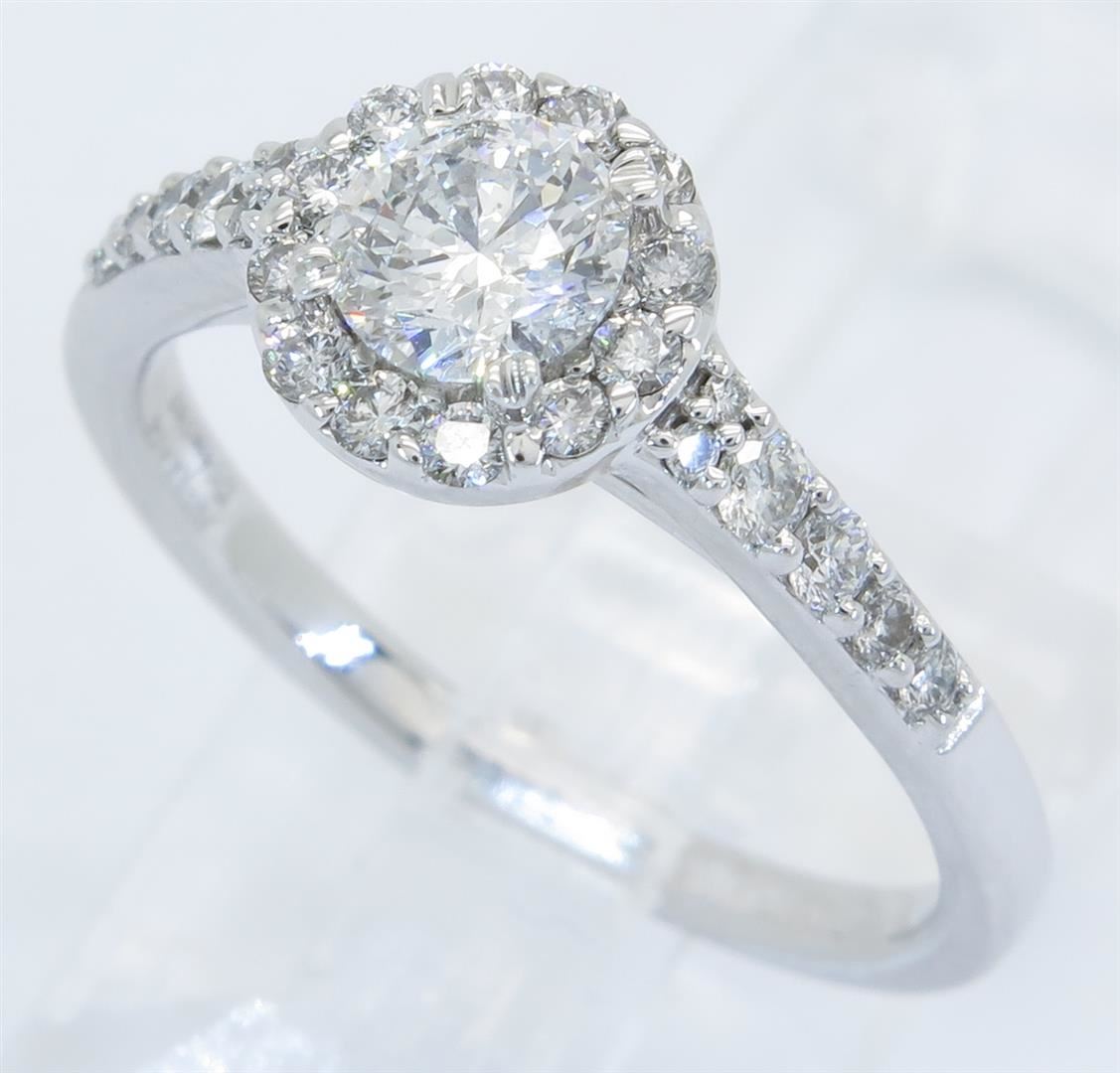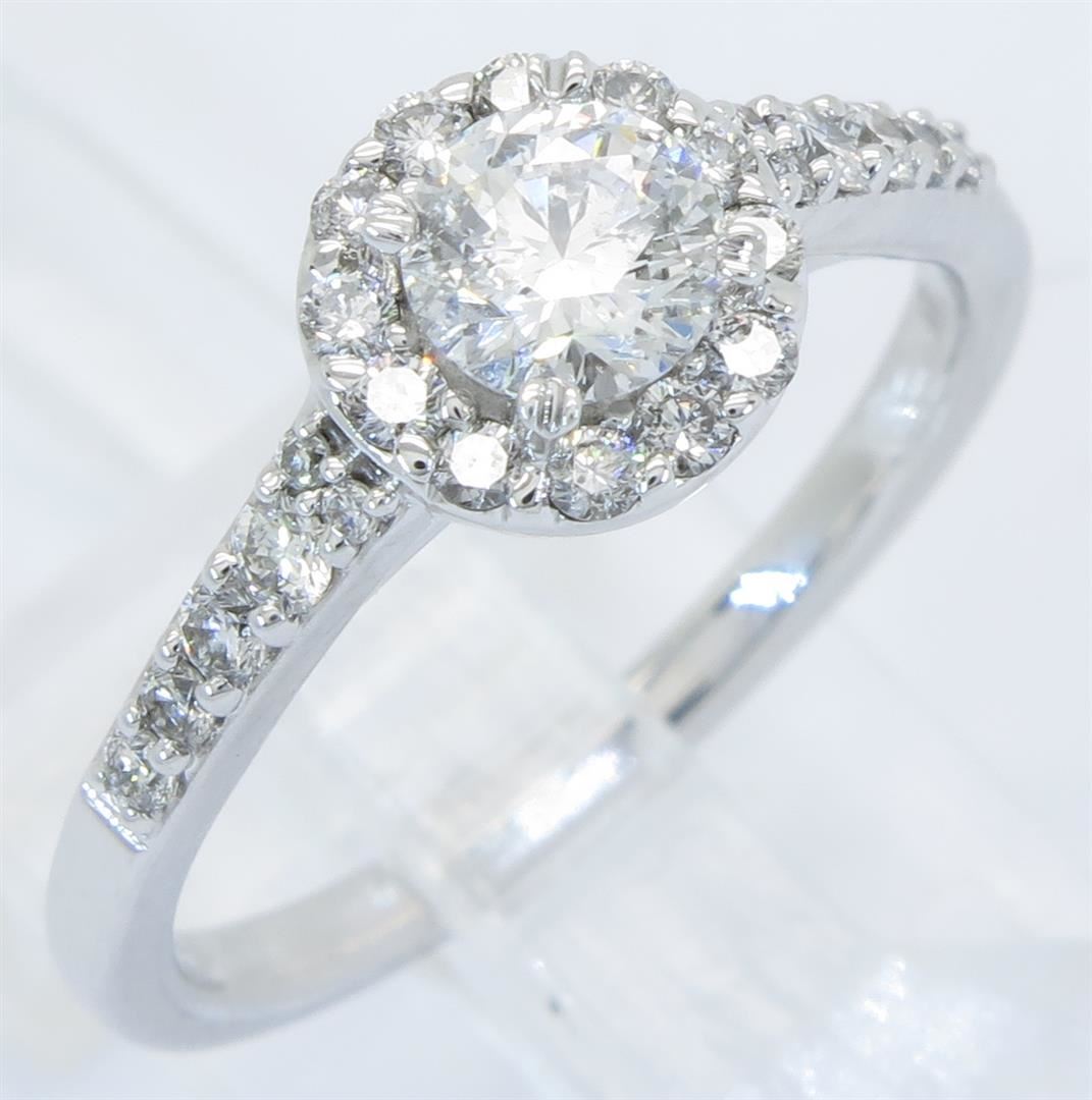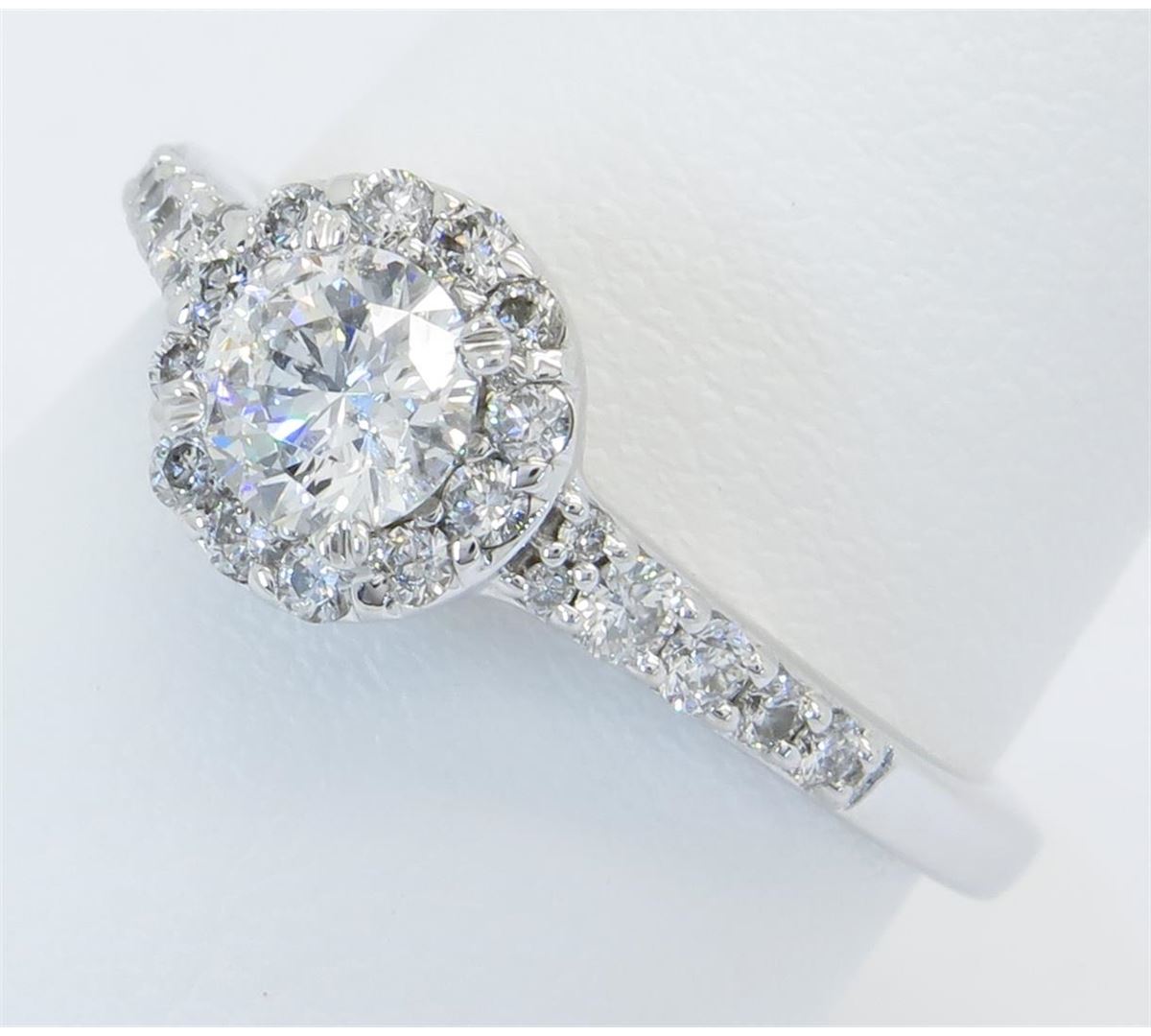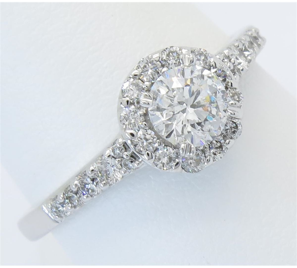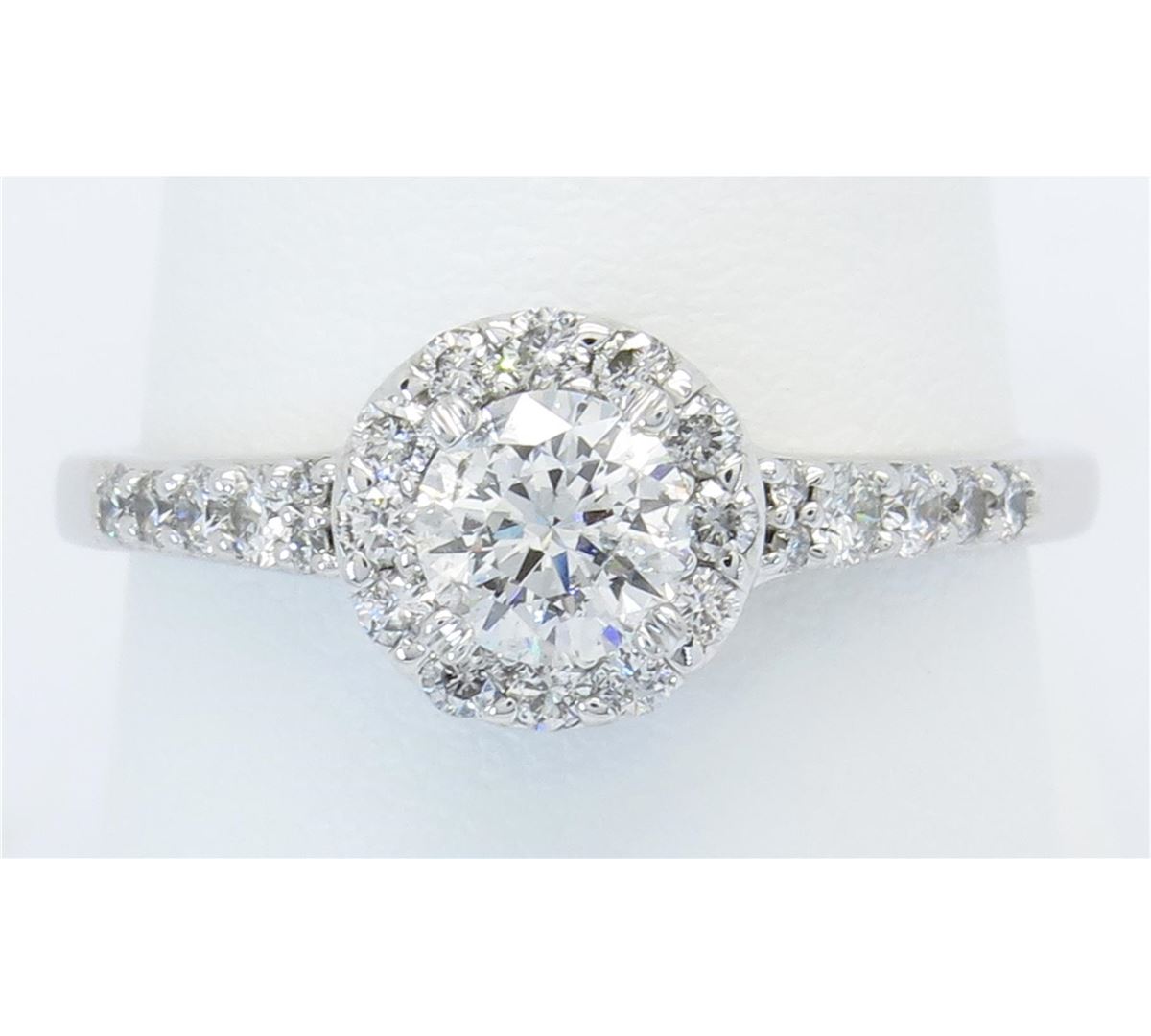 One tested 14K white gold diamond ring. Condition is new. Containing: One Round Noventa Cut Diamond. Approximate weight: .42CT, Clarity: I1, Color: F-G. 24 Round Brilliant Cut Diamonds. Approximate total diamond weight: .82CTW. Diamonds are graded in the mounting, unless otherwise stated. Weight of ring: 3.4 grams. Size: 6.75