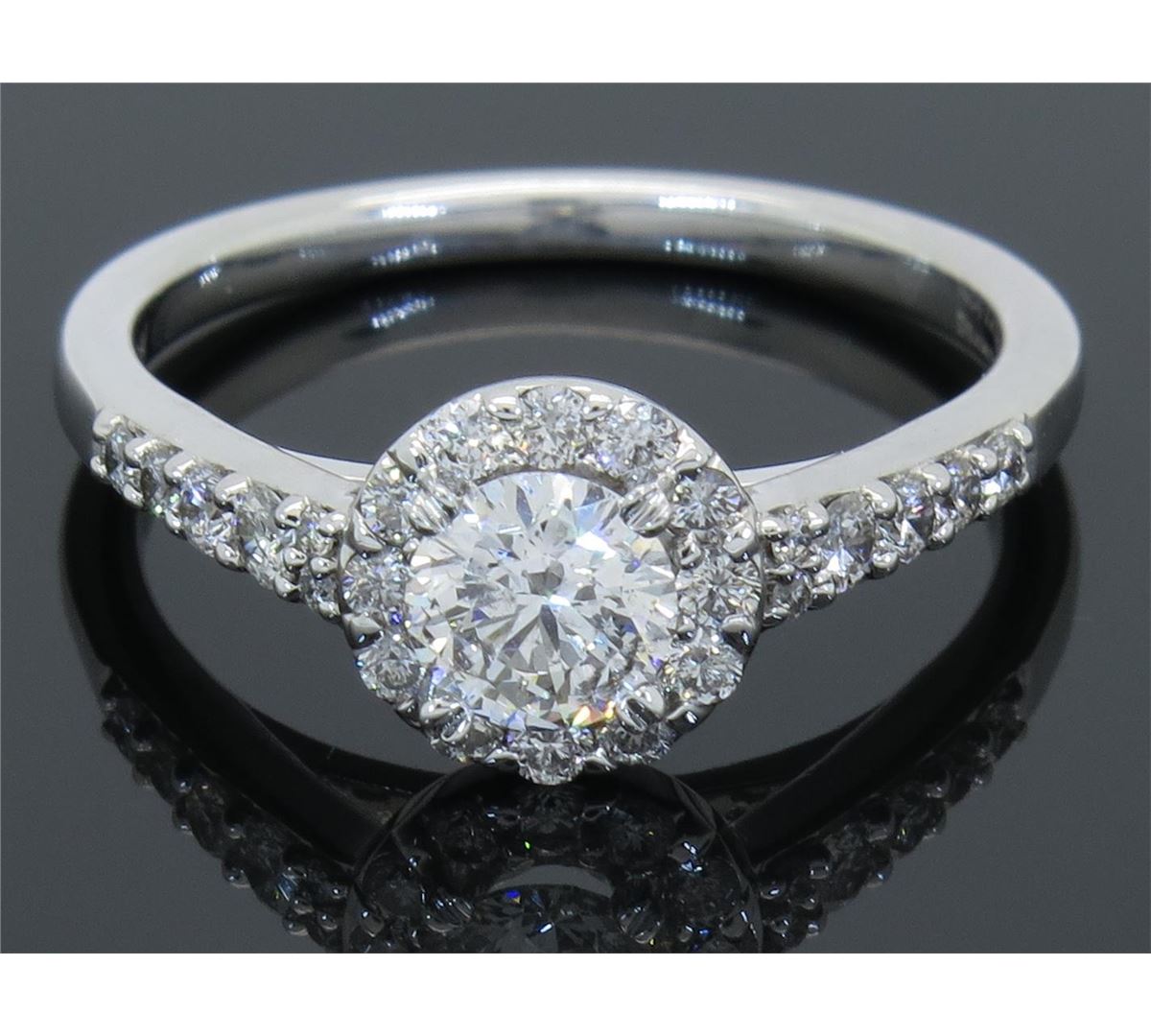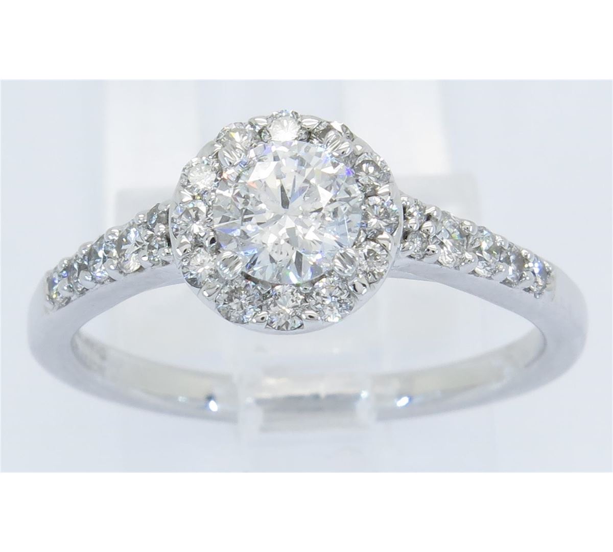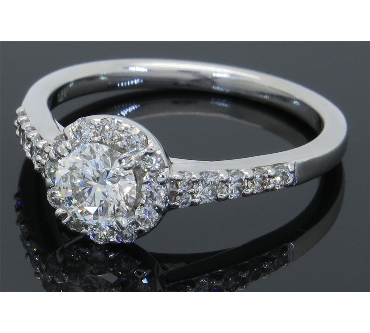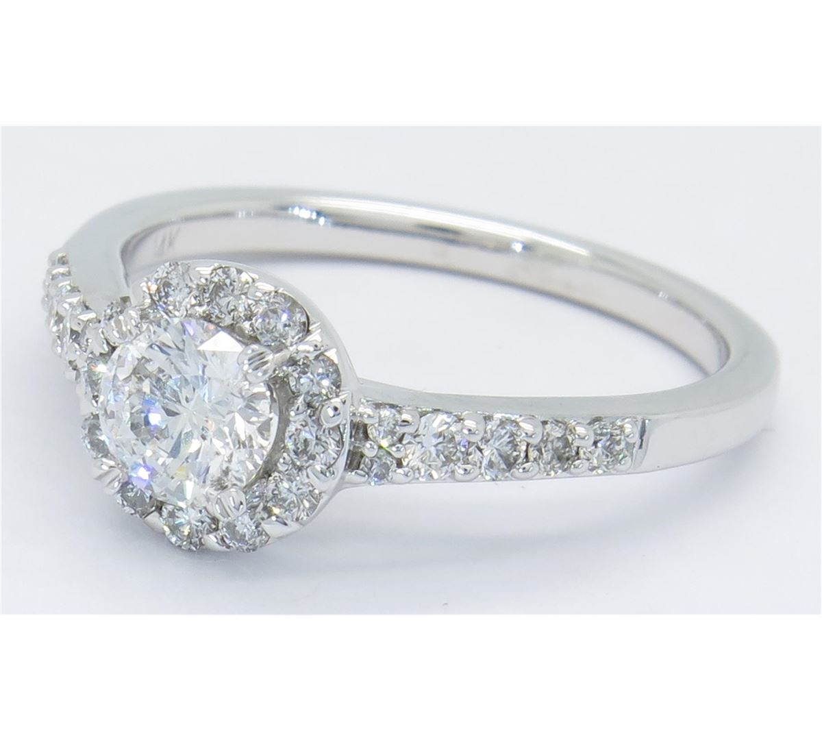 One tested 14K white gold diamond ring. Condition is new. Containing: One Round Noventa Cut Diamond. Approximate weight: .42CT, Clarity: I1, Color: F-G. 24 Round Brilliant Cut Diamonds. Approximate total diamond weight: .82CTW. Diamonds are graded in the mounting, unless otherwise stated. Weight of ring: 3.4 grams. Size: 6.75