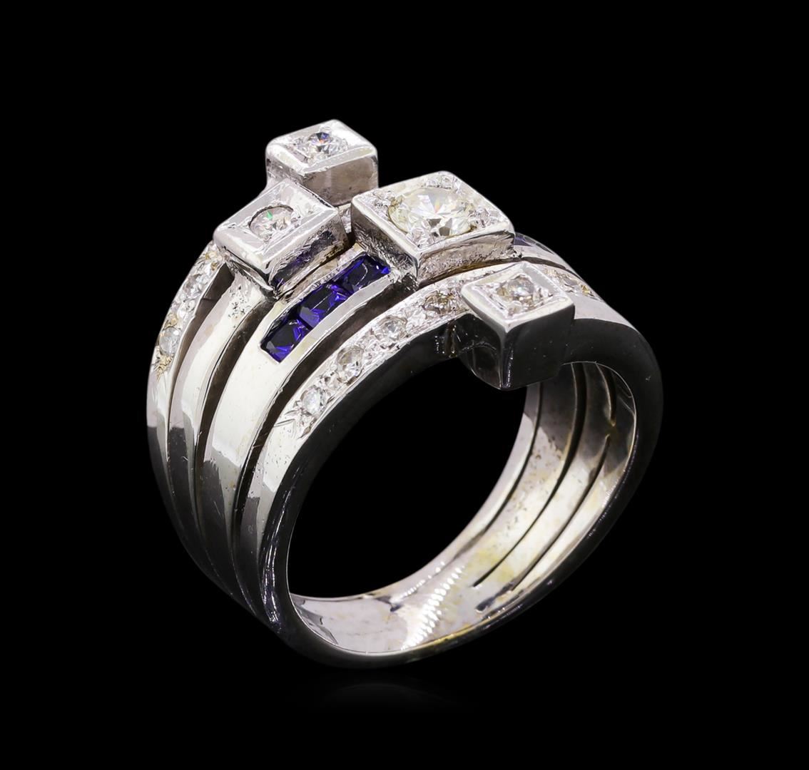 One electronically tested 14KT white gold ladies cast & assembled diamond and laboratory created sapphire stackable rings. The set contains three separate rings. The center ring features a diamond supported by laboratory created sapphire set shoulders. Each of the outside rings feature a stylized diamond bypass design. The stackable ring set is completed by combined soldered bands measuring five and one-half millimeters wide. Bright polish finish with milgrain detailing. Condition is good. Containing: Eighteen bead set round brilliant cut diamonds, measuring 1.70 - 1.50 x 0.96mm (depth est.) approximate total weight of 18 Stones = 0.32ct. Graded in the setting. Clarity: SI-2 to I-2 . Color: H - J Six channel set square brilliant cut laboratory created blue sapphires, measuring 2.50 x 2.50 x 1.63mm, approximate total weight of 0.70ct., clarity is eye clean, type II, medium dark, moderately strong, blue color, (GIA B 6/4), cut is good. Transmitting light with no distortion, transparent. Measurements & the color grade are an average for the group. Graded in the setting. One prong set round brilliant cut diamond, measuring 4.40 - 4.35 x 2.60mm (depth est.) approximate weight of 0.35ct. Graded in the setting. Clarity: VS-1 . Color: J Three prong set round brilliant cut diamonds, measuring 2.40 - 2.25 x 1.40mm (depth est.) approximate total weight of 3 Stones = 0.15ct. Graded in the setting. Clarity: SI-2 to I-1 . Color: J - K. Total Weight of Colored Stones 0.70ct.. Total Weight of Diamonds 0.82ct.. Total Weight of Stackable Rings 18.94gm. AIG Appraised at $6,500.00.