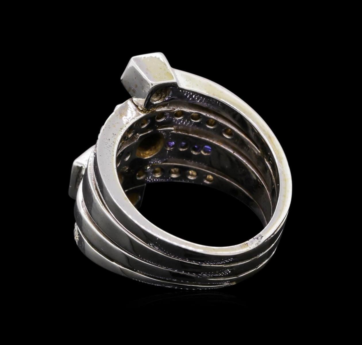 One electronically tested 14KT white gold ladies cast & assembled diamond and laboratory created sapphire stackable rings. The set contains three separate rings. The center ring features a diamond supported by laboratory created sapphire set shoulders. Each of the outside rings feature a stylized diamond bypass design. The stackable ring set is completed by combined soldered bands measuring five and one-half millimeters wide. Bright polish finish with milgrain detailing. Condition is good. Containing: Eighteen bead set round brilliant cut diamonds, measuring 1.70 - 1.50 x 0.96mm (depth est.) approximate total weight of 18 Stones = 0.32ct. Graded in the setting. Clarity: SI-2 to I-2 . Color: H - J Six channel set square brilliant cut laboratory created blue sapphires, measuring 2.50 x 2.50 x 1.63mm, approximate total weight of 0.70ct., clarity is eye clean, type II, medium dark, moderately strong, blue color, (GIA B 6/4), cut is good. Transmitting light with no distortion, transparent. Measurements & the color grade are an average for the group. Graded in the setting. One prong set round brilliant cut diamond, measuring 4.40 - 4.35 x 2.60mm (depth est.) approximate weight of 0.35ct. Graded in the setting. Clarity: VS-1 . Color: J Three prong set round brilliant cut diamonds, measuring 2.40 - 2.25 x 1.40mm (depth est.) approximate total weight of 3 Stones = 0.15ct. Graded in the setting. Clarity: SI-2 to I-1 . Color: J - K. Total Weight of Colored Stones 0.70ct.. Total Weight of Diamonds 0.82ct.. Total Weight of Stackable Rings 18.94gm. AIG Appraised.