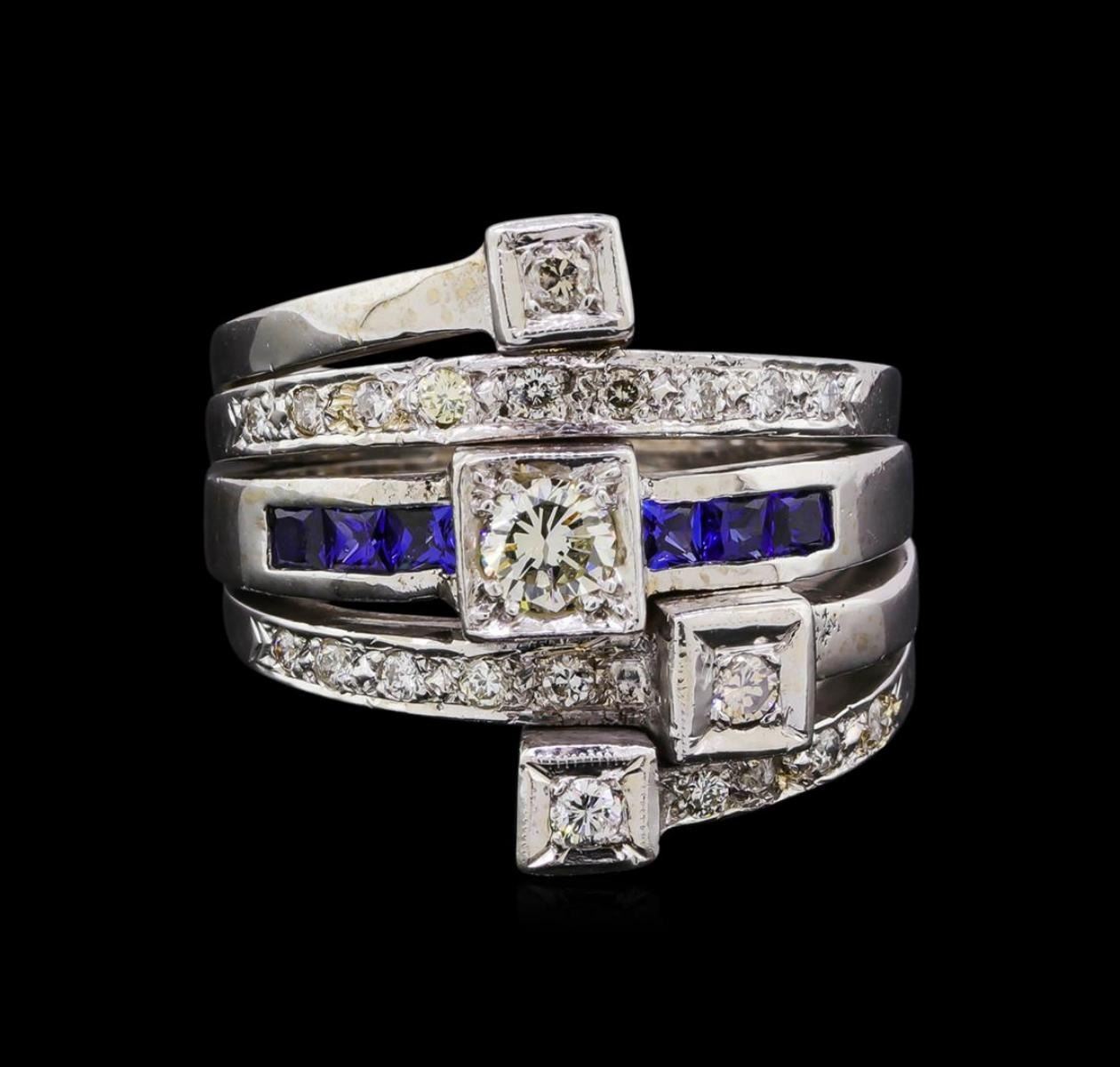 One electronically tested 14KT white gold ladies cast & assembled diamond and laboratory created sapphire stackable rings. The set contains three separate rings. The center ring features a diamond supported by laboratory created sapphire set shoulders. Each of the outside rings feature a stylized diamond bypass design. The stackable ring set is completed by combined soldered bands measuring five and one-half millimeters wide. Bright polish finish with milgrain detailing. Condition is good. Containing: Eighteen bead set round brilliant cut diamonds, measuring 1.70 - 1.50 x 0.96mm (depth est.) approximate total weight of 18 Stones = 0.32ct. Graded in the setting. Clarity: SI-2 to I-2 . Color: H - J Six channel set square brilliant cut laboratory created blue sapphires, measuring 2.50 x 2.50 x 1.63mm, approximate total weight of 0.70ct., clarity is eye clean, type II, medium dark, moderately strong, blue color, (GIA B 6/4), cut is good. Transmitting light with no distortion, transparent. Measurements & the color grade are an average for the group. Graded in the setting. One prong set round brilliant cut diamond, measuring 4.40 - 4.35 x 2.60mm (depth est.) approximate weight of 0.35ct. Graded in the setting. Clarity: VS-1 . Color: J Three prong set round brilliant cut diamonds, measuring 2.40 - 2.25 x 1.40mm (depth est.) approximate total weight of 3 Stones = 0.15ct. Graded in the setting. Clarity: SI-2 to I-1 . Color: J - K. Total Weight of Colored Stones 0.70ct.. Total Weight of Diamonds 0.82ct.. Total Weight of Stackable Rings 18.94gm. AIG Appraised.