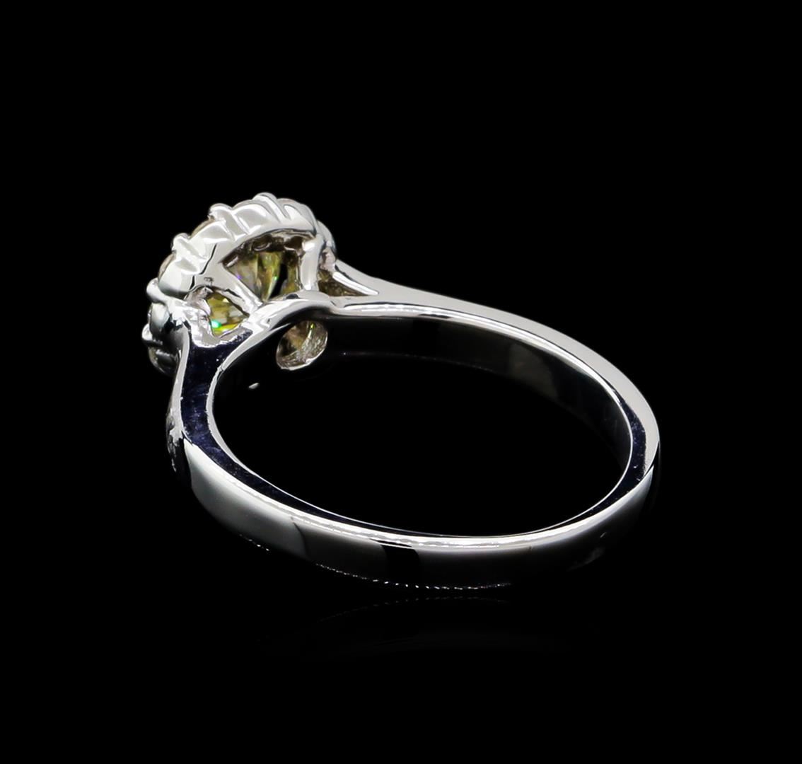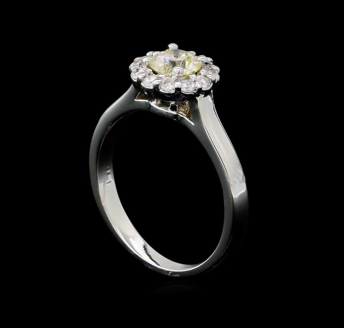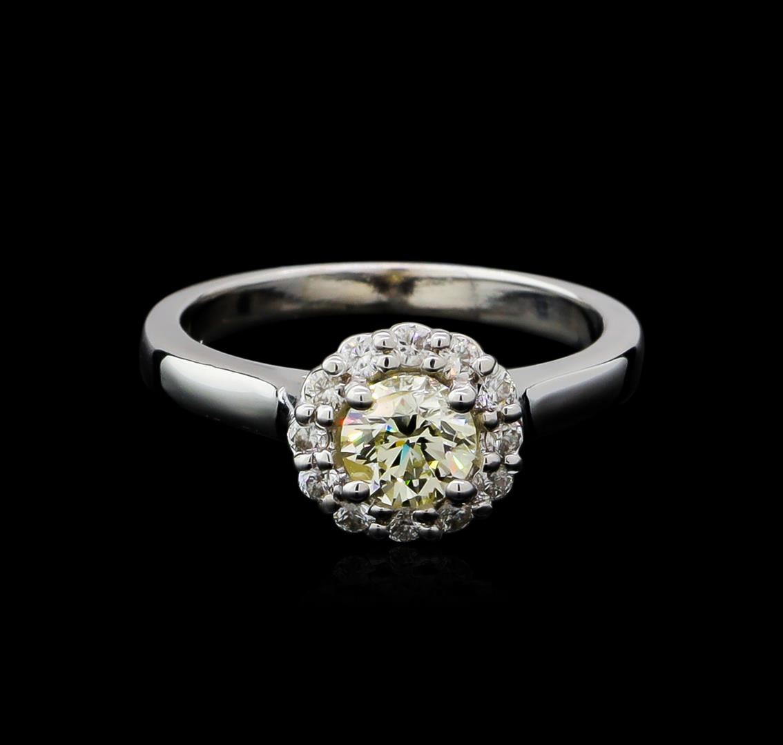 One electronically tested 14KT white gold ladies cast diamond unity ring with a bright polish finish. The featured diamond is set within a diamond bezel, completed by a two millimeter wide band. Identified with markings of "14K". Condition is new, good workmanship. Containing: One prong set round brilliant cut diamond, measuring 5.40 - 5.35 x 3.35mm (depth est.) approximate weight of 0.60ct. Graded in the setting. Clarity: I-1. Depth: 62.3%. Table 52.0%. Twelve prong set round brilliant cut diamonds approximate total weight of 12 Stones = 0.22ct. Graded in the setting. Clarity: SI-2 to I-1. Color: G - I. Total Weight of Diamonds 0.82ct. Total Weight of Ring 3.83gm. AIG Appraised at $2,990.00.