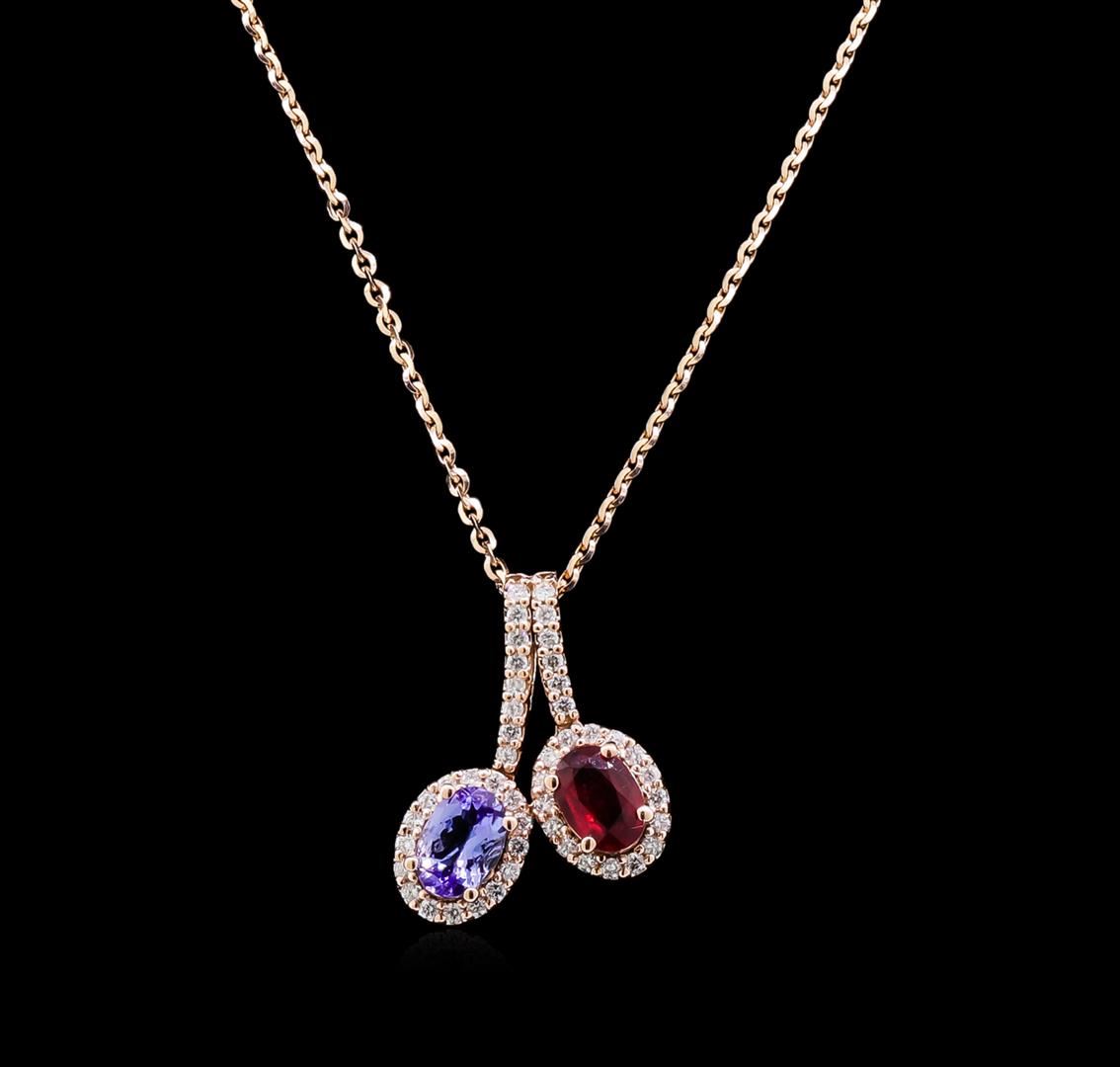 One pendant featuring: 14KT rose gold weighing 3.20 grams containing one ruby with a total weight of 0.82ct and one tanzanite with a total weight of 0.70ct and side diamonds with a total weight of 0.40ct.