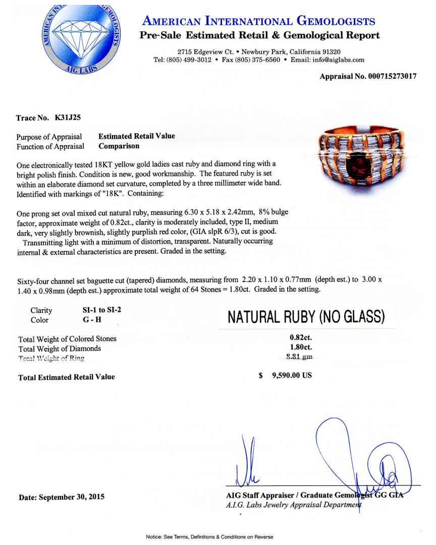 One electronically tested 18KT yellow gold ladies cast ruby and diamond ring with a bright polish finish. Condition is new, good workmanship. The featured ruby is set within an elaborate diamond set curvature, completed by a three millimeter wide band. Identified with markings of "18K". Containing: One prong set oval mixed cut natural ruby, measuring 6.30 x 5.18 x 2.42mm, 8% bulge factor, approximate weight of 0.82ct., clarity is moderately included, type II, medium dark, very slightly brownish, slightly purplish red color, (GIA slpR 6/3), cut is good. Transmitting light with a minimum of distortion, transparent. Naturally occurring internal & external characteristics are present. Graded in the setting. Sixty-four channel set baguette cut (tapered) diamonds, measuring from 2.20 x 1.10 x 0.77mm (depth est.) to 3.00 x 1.40 x 0.98mm (depth est.) approximate total weight of 64 Stones = 1.80ctw. Graded in the setting. Clarity SI1 to SI2 Color G - H Total Weight of Colored Stones 0.82ct. Total Weight of Diamonds 1.80ctw. Total Weight of Ring 8.81 gm NATURAL RUBY (NO GLASS) #LREF-3125