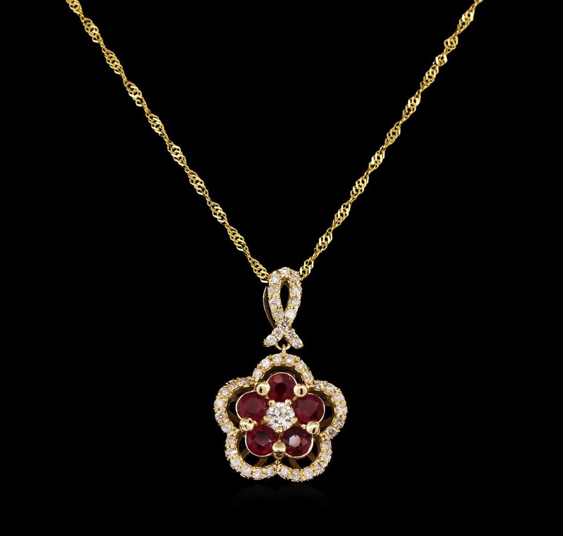 One pendant with chain featuring: 14KT yellow gold weighing 3.05 grams containing 5 rubies with a total weight of 0.82ct and diamonds with a total weight of 0.39ct.