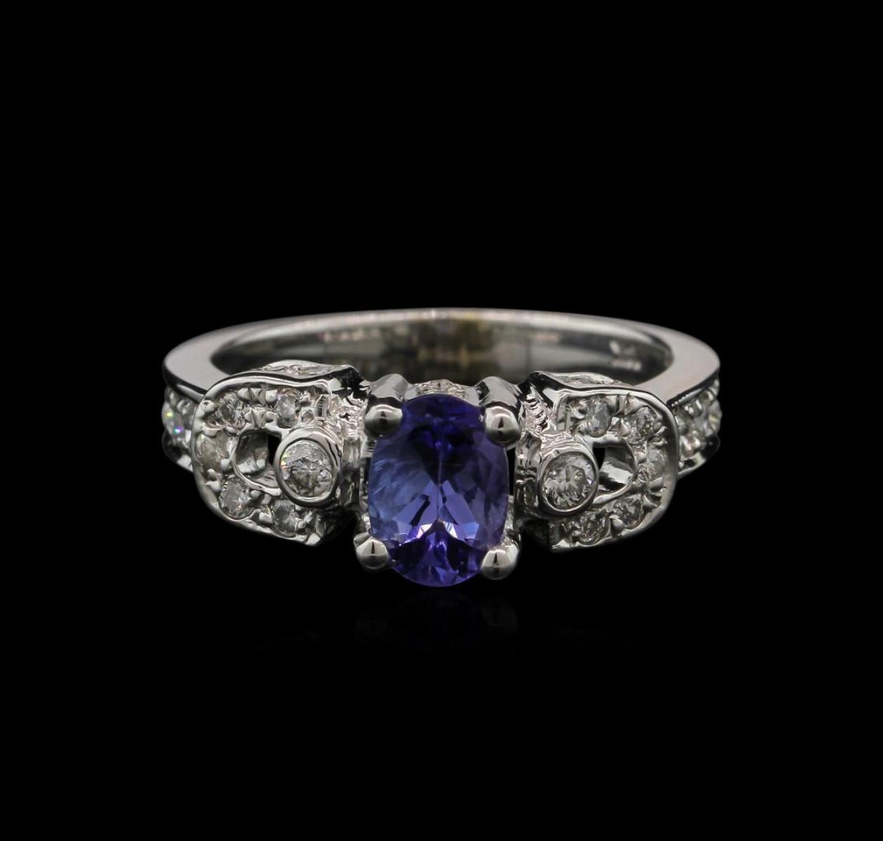One ring featuring: 14KT white gold weighing 5.33 grams containing one prong set oval shape tanzanite center stone with a total weight of 0.82ct and pave and bezel set round diamonds with a total weight of 0.30 ct.