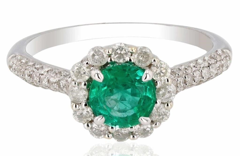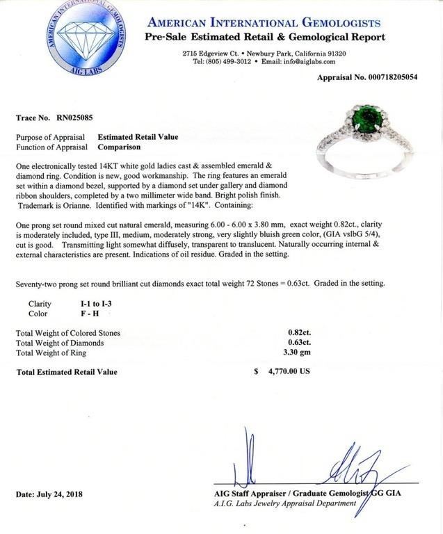 One electronically tested 14KT white gold ladies cast and assembled emerald and diamond ring. Condition is new, good workmanship. The ring features an emerald set within a diamond bezel, supported by a diamond set under gallery and diamond ribbon shoulders, completed by a two millimeter wide band. Bright polish finish. Trademark is Orianne. Identified with markings of "14K". Containing: One prong set round mixed cut natural emerald, measuring 6.00mm to 6.00mm x 3.80mm, exact weight 0.82ct., clarity is moderately included, type III, medium, moderately strong, very slightly bluish green color, (GIA vslbG 5/4), cut is good. Transmitting light somewhat diffusely, transparent to translucent. Naturally occurring internal and external characteristics are present. Indications of oil residue. Graded in the setting. Seventy-two prong set round brilliant cut diamonds exact total weight 72 Stones = 0.63ct. Graded in the setting. Clarity I1 to I3 Color F - H Total Weight of Colored Stones 0.82ct. Total Weight of Diamonds 0.63ct.