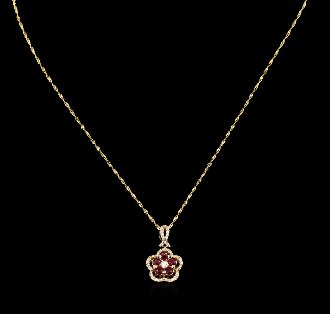 One pendant with chain featuring: 14KT yellow gold weighing 3.05 grams containing 5 rubies with a total weight of 0.82ct and diamonds with a total weight of 0.39ct.