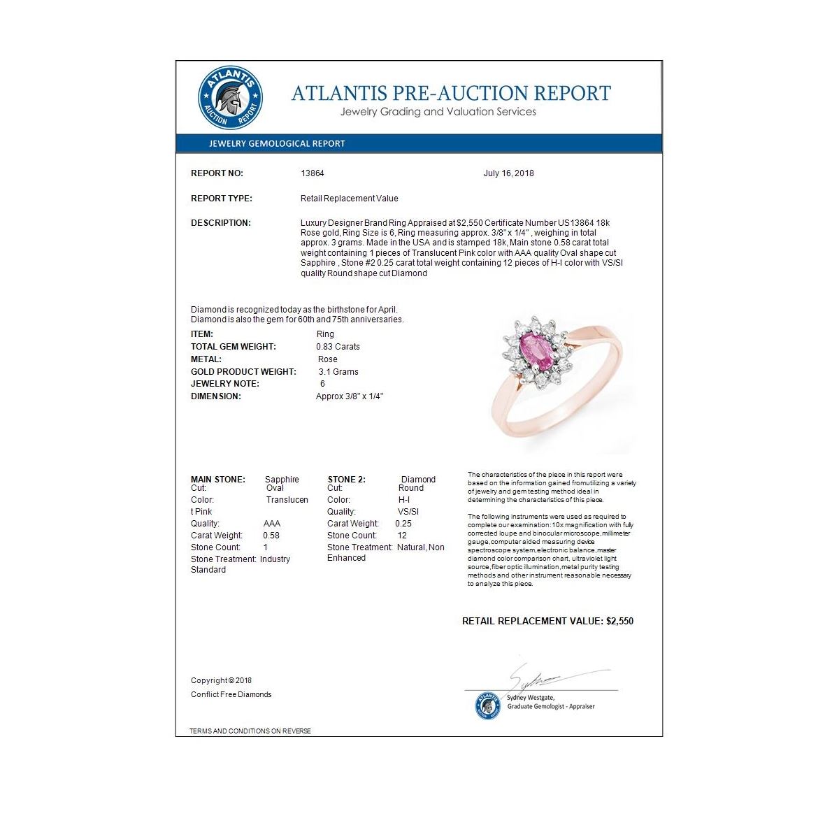 REF-38W9F -13864 ---- 0.83 CTW Pink Sapphire & Diamond Ring 18K Rose Gold ---- Luxury Designer Brand Ring Appraised at $2,550 Certificate Number US13864 18k Rose gold, Ring Size is 6, Ring measuring approx. 3/8" x 1/4" , weighing in total approx. 3 grams. Made in the USA and is stamped 18k, Main stone 0.58 carat total weight containing 1 pieces of Translucent Pink color with AAA quality Oval shape cut Sapphire , Stone #2 0.25 carat total weight containing 12 pieces of H-I color with VS/SI quality Round shape cut Diamond