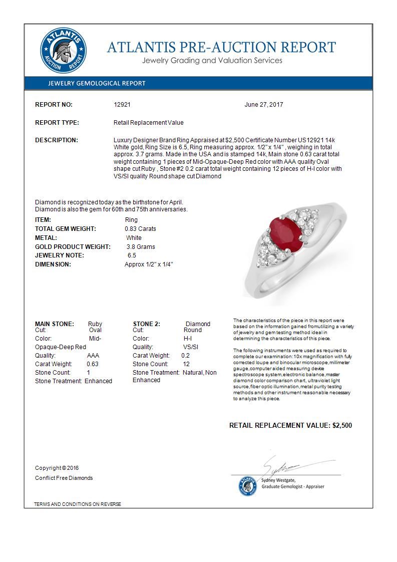 0.83 CTW Ruby & Diamond Ring 14K White Gold ---- Luxury Designer Brand Ring Appraised Retail Price at $2,500 ---- SKU Number US12921 14k White gold Ring Size is 6.5, Ring measuring approx. 1/2" x 1/4" , weighing in total approx. 3.7 grams. Made in the USA and is stamped 14k, Main stone 0.63 carat total weight containing 1 pieces of Mid-Opaque-Deep Red color with AAA quality Oval shape cut Ruby , Stone #2 0.2 carat total weight containing 12 pieces of H-I color with VS/SI quality Round shape cut