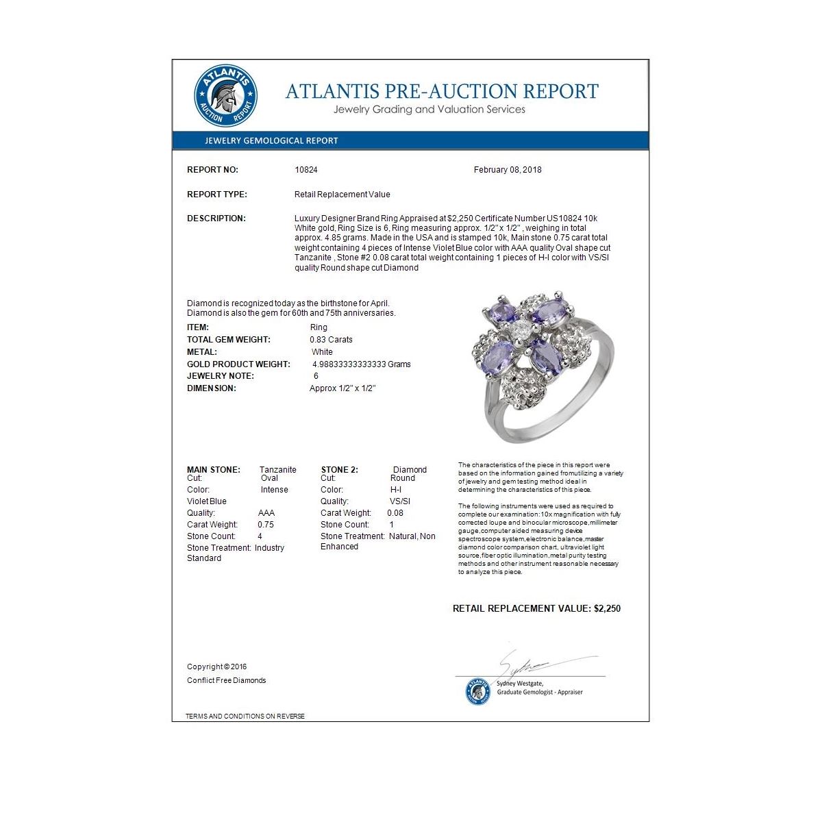 REF-31W3F -10824 ---- 0.83 CTW Tanzanite & Diamond Ring 10K White Gold ---- Luxury Designer Brand Ring Appraised at $2,250 Certificate Number US10824 10k White gold, Ring Size is 6, Ring measuring approx. 1/2" x 1/2" , weighing in total approx. 4.85 grams. Made in the USA and is stamped 10k, Main stone 0.75 carat total weight containing 4 pieces of Intense Violet Blue color with AAA quality Oval shape cut Tanzanite , Stone #2 0.08 carat total weight containing 1 pieces of H-I color with VS/SI quality Round shape cut Diamond