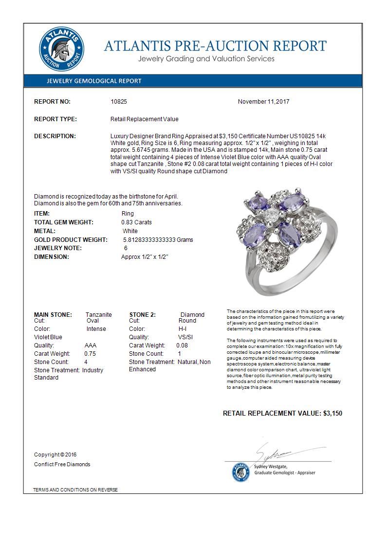 REF-44Y2K -10825 ---- 0.83 CTW Tanzanite & Diamond Ring 14K White Gold ---- Luxury Designer Brand Ring Appraised at $3,150 Certificate Number US10825 14k White gold, Ring Size is 6, Ring measuring approx. 1/2" x 1/2" , weighing in total approx. 5.6745 grams. Made in the USA and is stamped 14k, Main stone 0.75 carat total weight containing 4 pieces of Intense Violet Blue color with AAA quality Oval shape cut Tanzanite , Stone #2 0.08 carat total weight containing 1 pieces of H-I color with VS/SI quality Round shape cut Diamond