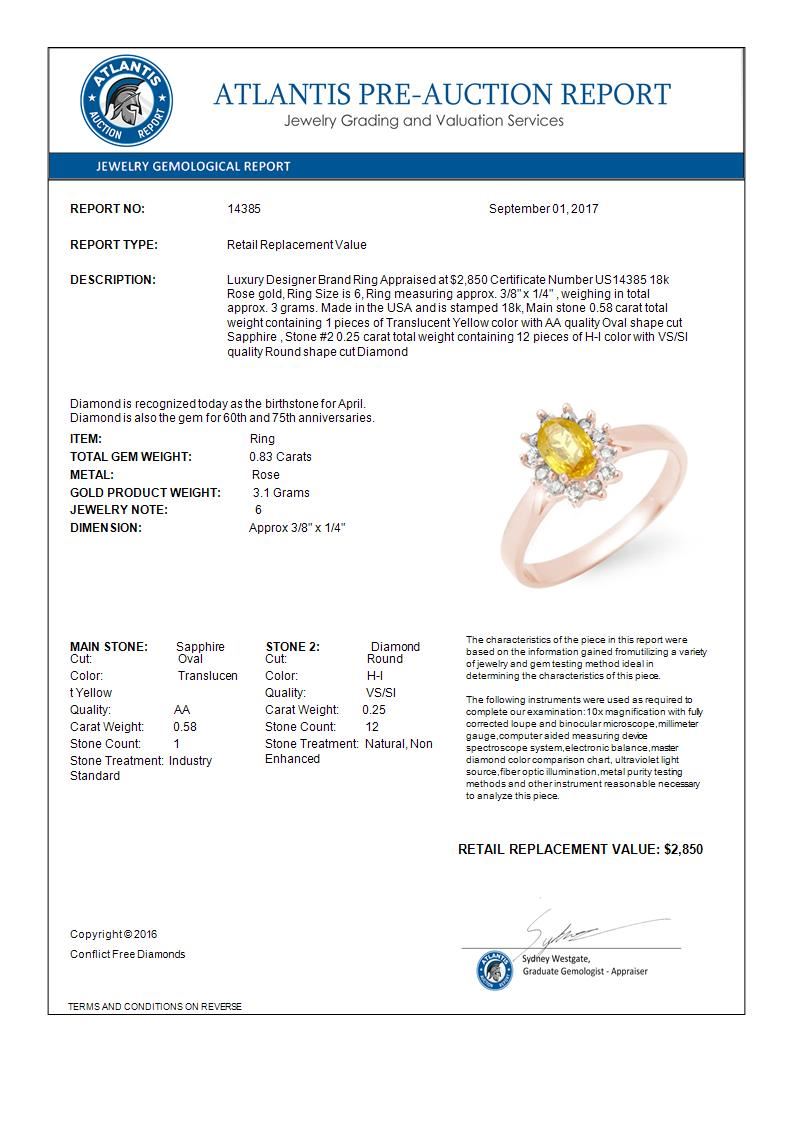14385 - REF-39N6A ---- 0.83 CTW Yellow Sapphire & Diamond Ring 18K Rose Gold ---- Luxury Designer Brand Ring Appraised at $2,850 Certificate Number US14385 18k Rose gold, Ring Size is 6, Ring measuring approx. 3/8" x 1/4" , weighing in total approx. 3 grams. Made in the USA and is stamped 18k, Main stone 0.58 carat total weight containing 1 pieces of Translucent Yellow color with AA quality Oval shape cut Sapphire , Stone #2 0.25 carat total weight containing 12 pieces of H-I color with VS/SI quality Round shape cut Diamond