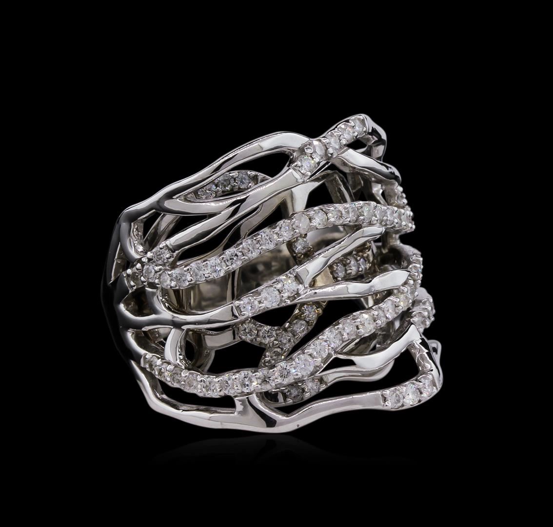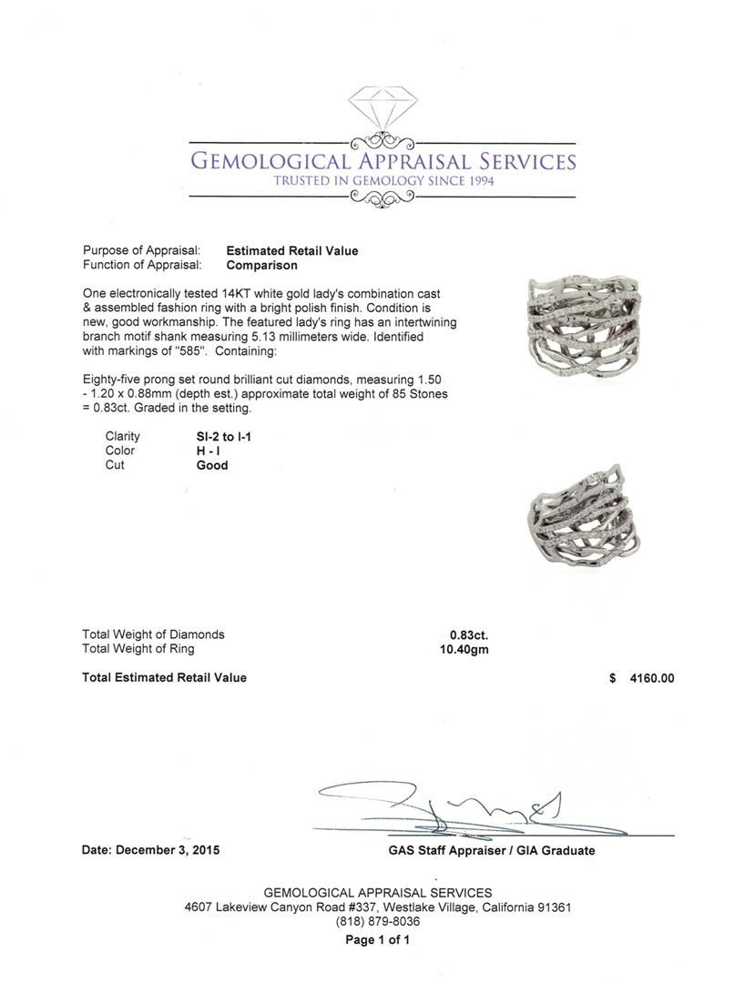 One electronically tested 14KT white gold lady's combination cast & assembled fashion ring with a bright polish finish. The featured lady's ring has an intertwining branch motif shank measuring 5.13 millimeters wide. Identified with markings of "585". Condition is new, good workmanship. Containing: Eighty-Five prong set round brilliant cut diamonds, measuring 1.50 - 1.20 x 0.88mm (depth est.) approximate total weight of 85 Stones = 0.83ct. Graded in the setting. Clarity: SI-2 to I-1. Color: H - I. Cut Good. Total Weight of Diamonds 0.83ct. Total Weight of Ring 10.40gm. GAS Appraised.
