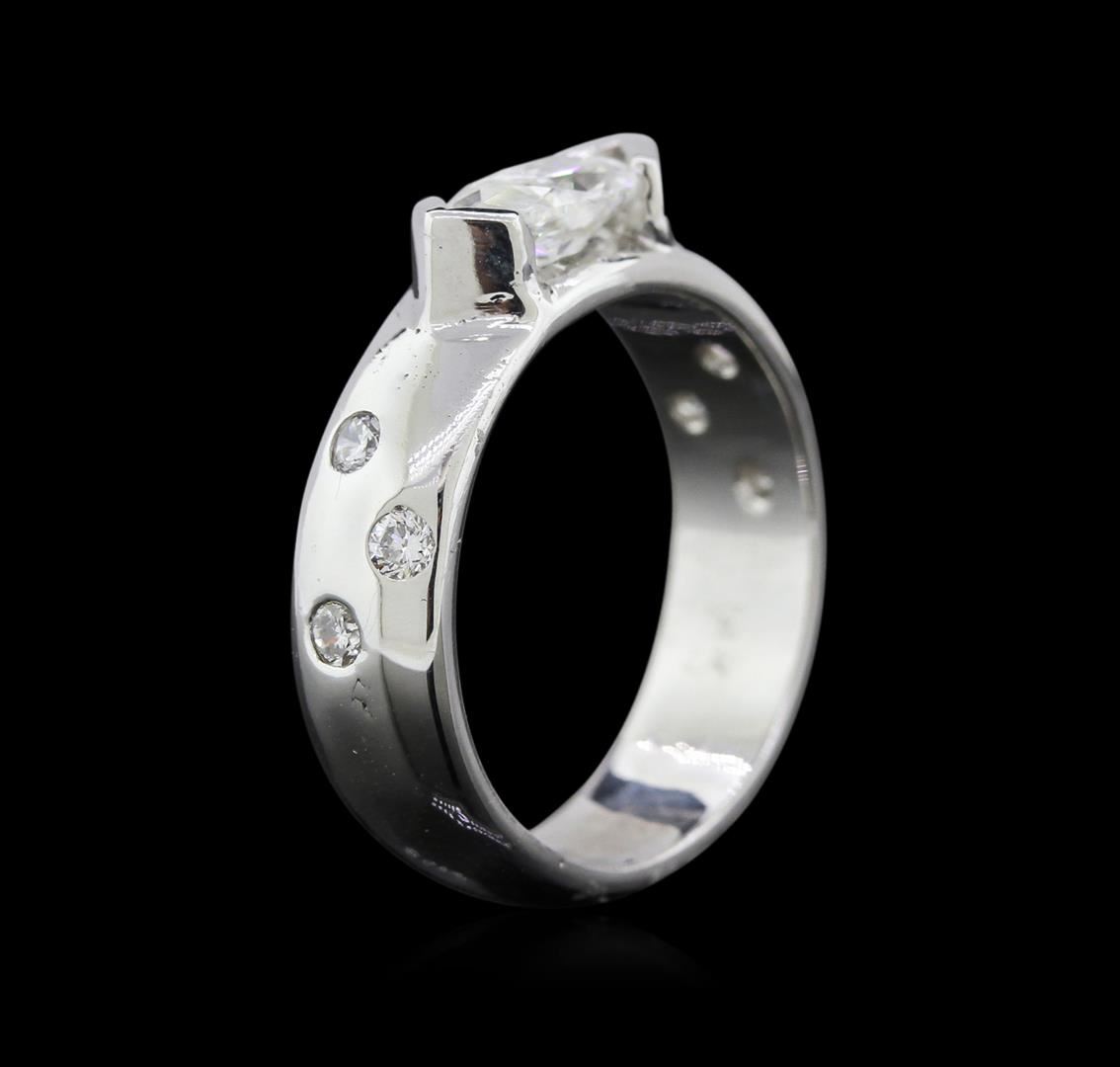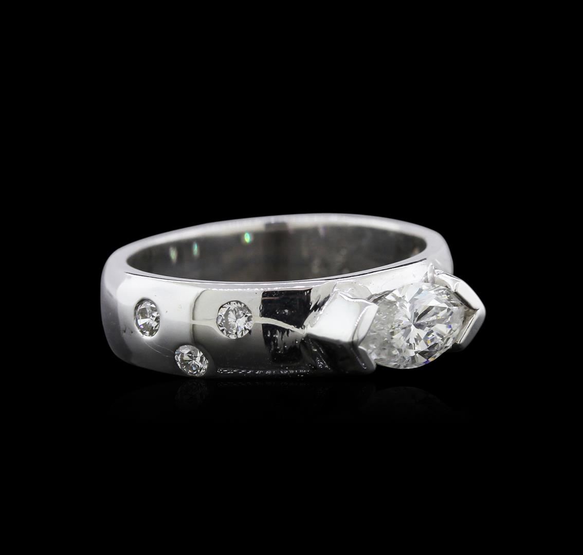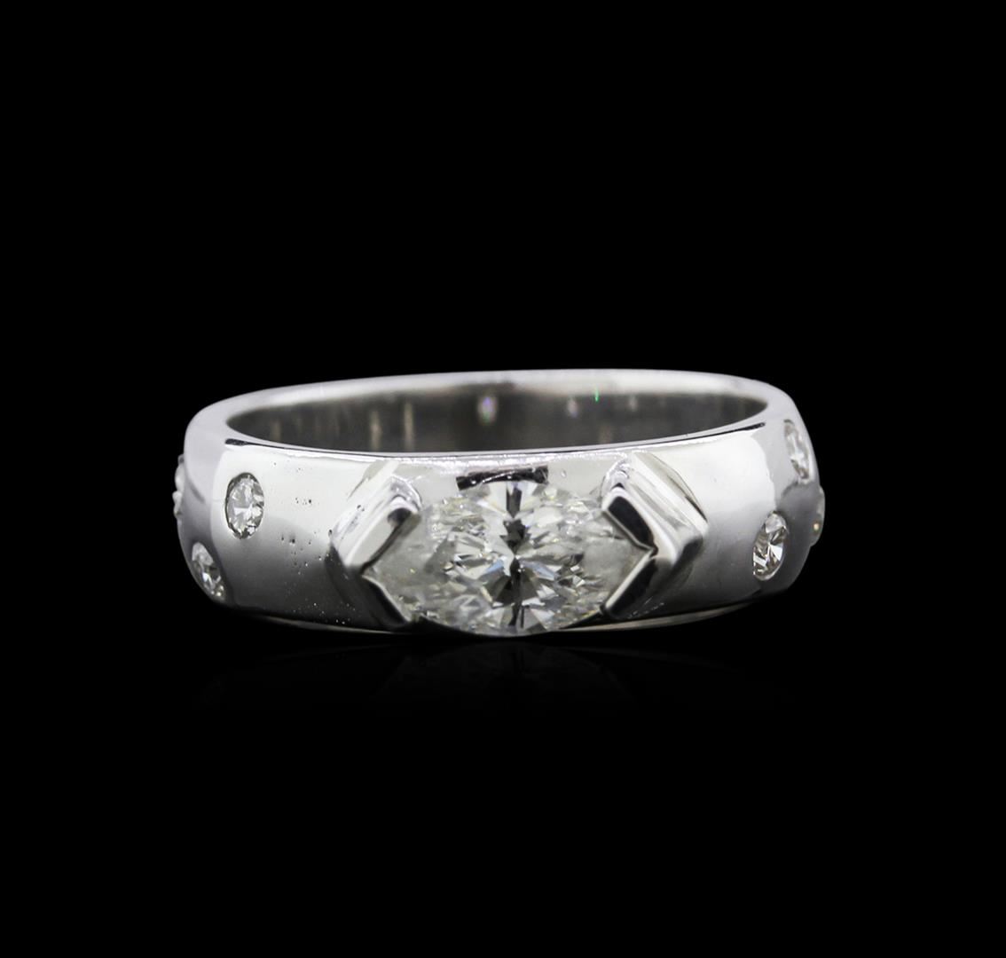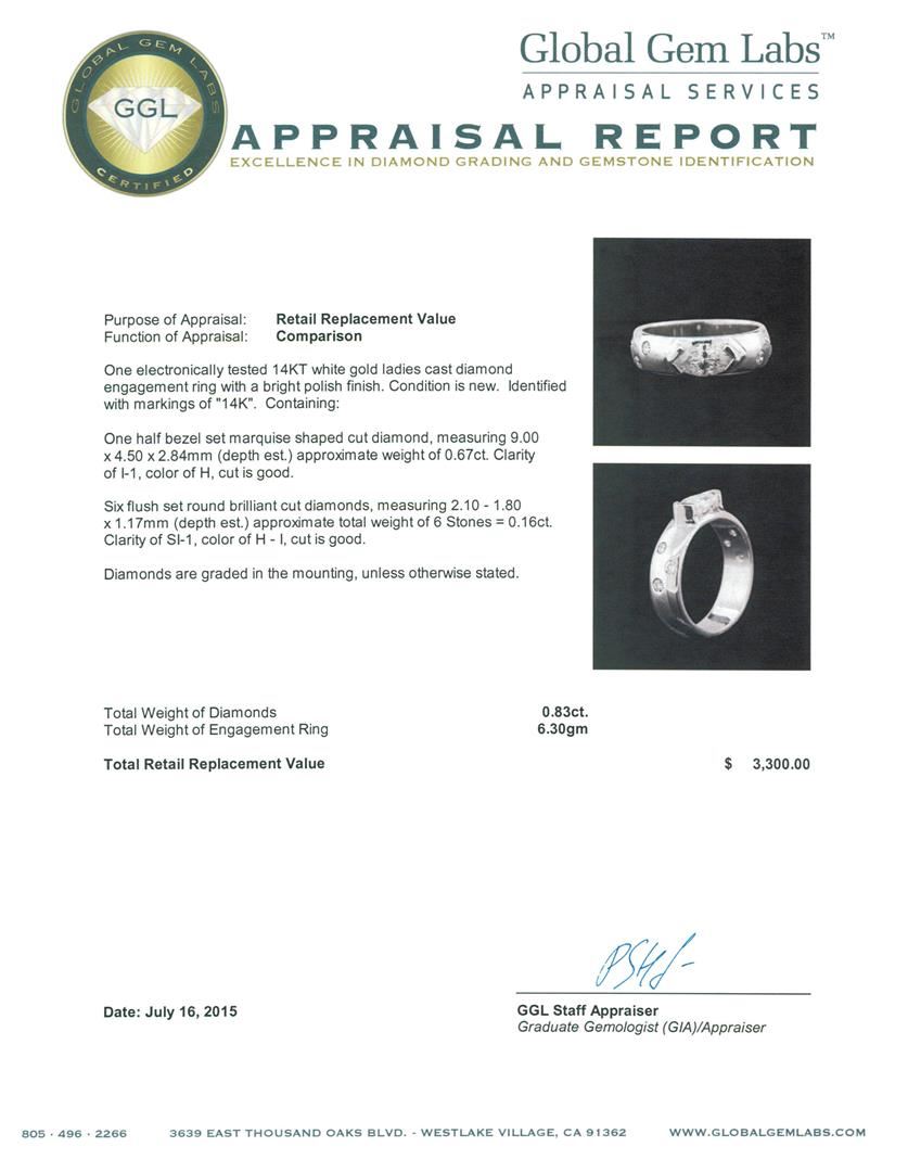 One electronically tested 14KT white gold ladies cast diamond engagement ring with a bright polish finish. Identified with markings of "14K". Condition is new. Containing: One half bezel set marquise shaped cut diamond, measuring 9.00 x 4.50 x 2.84mm (depth est.) approximate weight of 0.67ct. Clarity: I-1. Color: H, Cut is Good. Six flush set round brilliant cut diamonds, measuring 2.10 - 1.80 x 1.17mm (depth est.) approximate total weight of 6 Stones = 0.16ct. Clarity: SI-1. Color: H - I, Cut is Good. Diamonds are graded in the mounting, unless otherwise stated. Total Weight of Diamonds 0.83ct. Total Weight of Engagement Ring 6.30 grams. GGL Appraised at $3,300.00.
