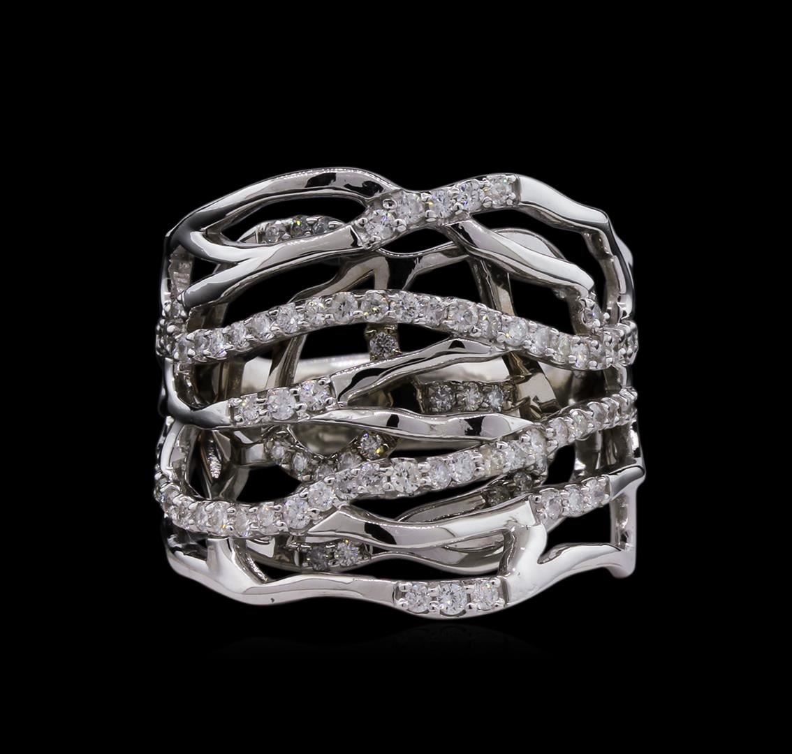 One electronically tested 14KT white gold lady's combination cast & assembled fashion ring with a bright polish finish. The featured lady's ring has an intertwining branch motif shank measuring 5.13 millimeters wide. Identified with markings of "585". Condition is new, good workmanship. Containing: Eighty-Five prong set round brilliant cut diamonds, measuring 1.50 - 1.20 x 0.88mm (depth est.) approximate total weight of 85 Stones = 0.83ct. Graded in the setting. Clarity: SI-2 to I-1. Color: H - I. Cut Good. Total Weight of Diamonds 0.83ct. Total Weight of Ring 10.40gm. GAS Appraised.