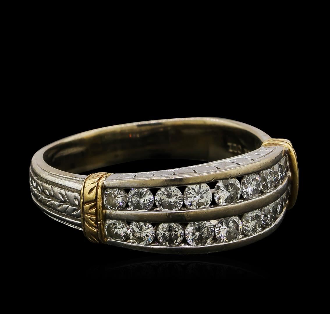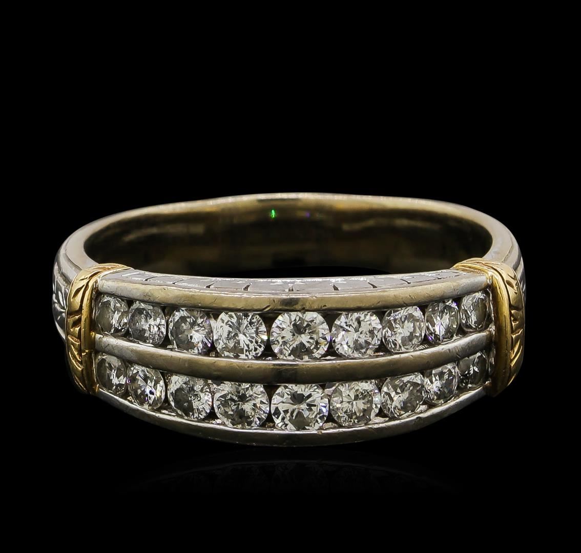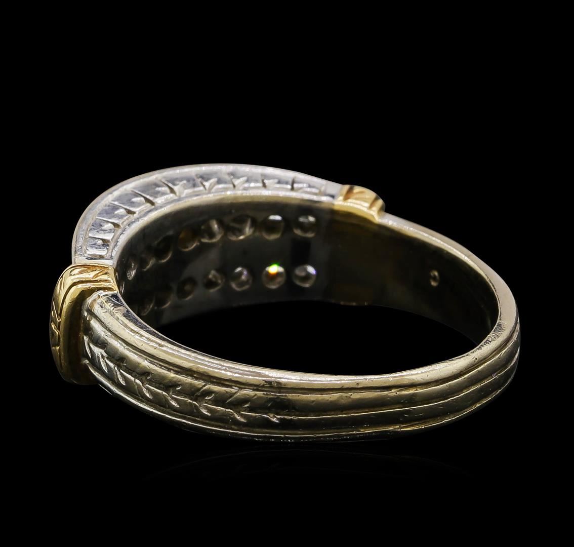 One electronically tested 14KT white and yellow gold man's cast fashion ring with a tapered shank with a bright polish, hand-engraved detail finish. The featured man's ring has a center diamond section with yellow gold cuff shoulders and a shank measuring 3.63 millimeters wide. Identified with markings of '14K'. Condition is used, good workmanship. Containing: Eighteen channel set round brilliant cut diamonds, measuring 2.50 - 2.10 x 1.43mm (depth est.) approximate total weight of 18 Stones = 0.83ct. Graded in the setting. Clarity SI-1 to SI-2. Color: H - I Cut Good. Total Weight of Diamonds 0.83ct.. Total Weight of Ring 7.80gm. GAS Appraised at $3,260.00.