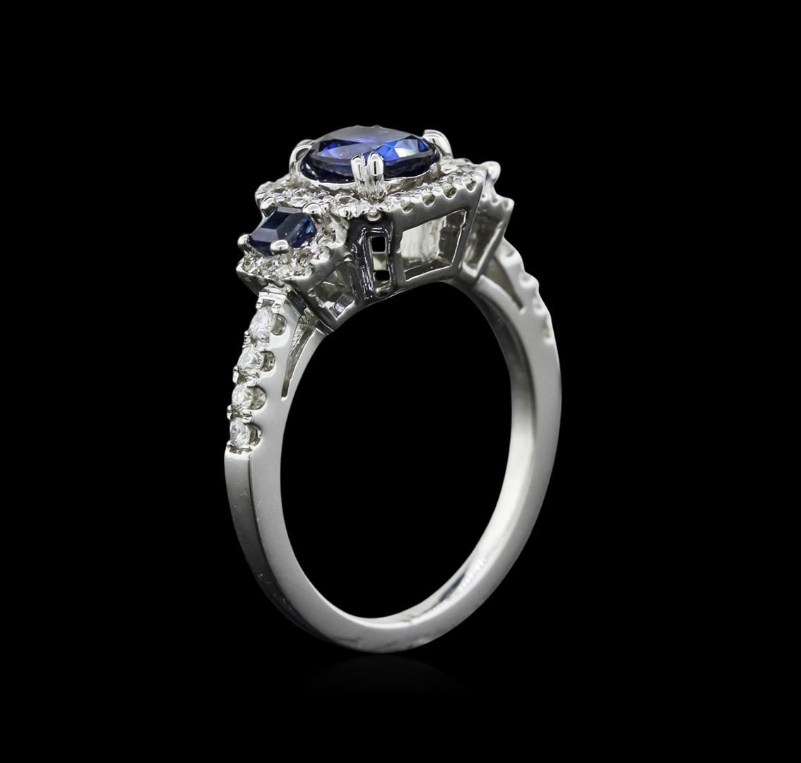 One electronically tested 14KT white gold ladies cast sapphire and diamond ring with a bright polish finish. Identified with markings of "14K". Condition is new. Containing: One prong set oval modified brilliant cut natural blue sapphire, measuring 6.50 x 4.20 x 2.73mm, approximate weight of 0.63ct., clarity is eye clean, type II, medium, moderately strong, blue color, (GIA B 5/4), cut is very good. Two prong set square standard step cut natural blue sapphires, measuring 2.50 x 2.50 x 1.63mm, approximate total weight of 0.20ct., clarity is eye clean, type II, medium, moderately strong, blue color, (GIA B 5/4), cut is very good. Forty-Two prong set round brilliant cut diamonds, measuring 1.50 - 1.10 x 0.78mm (depth est.) approximate total weight of 42 Stones = 0.34ct. Clarity: SI-1 to SI-2. Color: G - H, Cut is Good. Colored gemstones are presumed to have been subjected to commonly used enhancement processes. All diamonds and colored gemstones are graded in the mounting, unless otherwise stated. Total Weight of Colored Stones 0.83ct. Total Weight of Diamonds 0.34ct. Total Weight of Ring 4.90gm. GGL Appraised at $2,460.00.