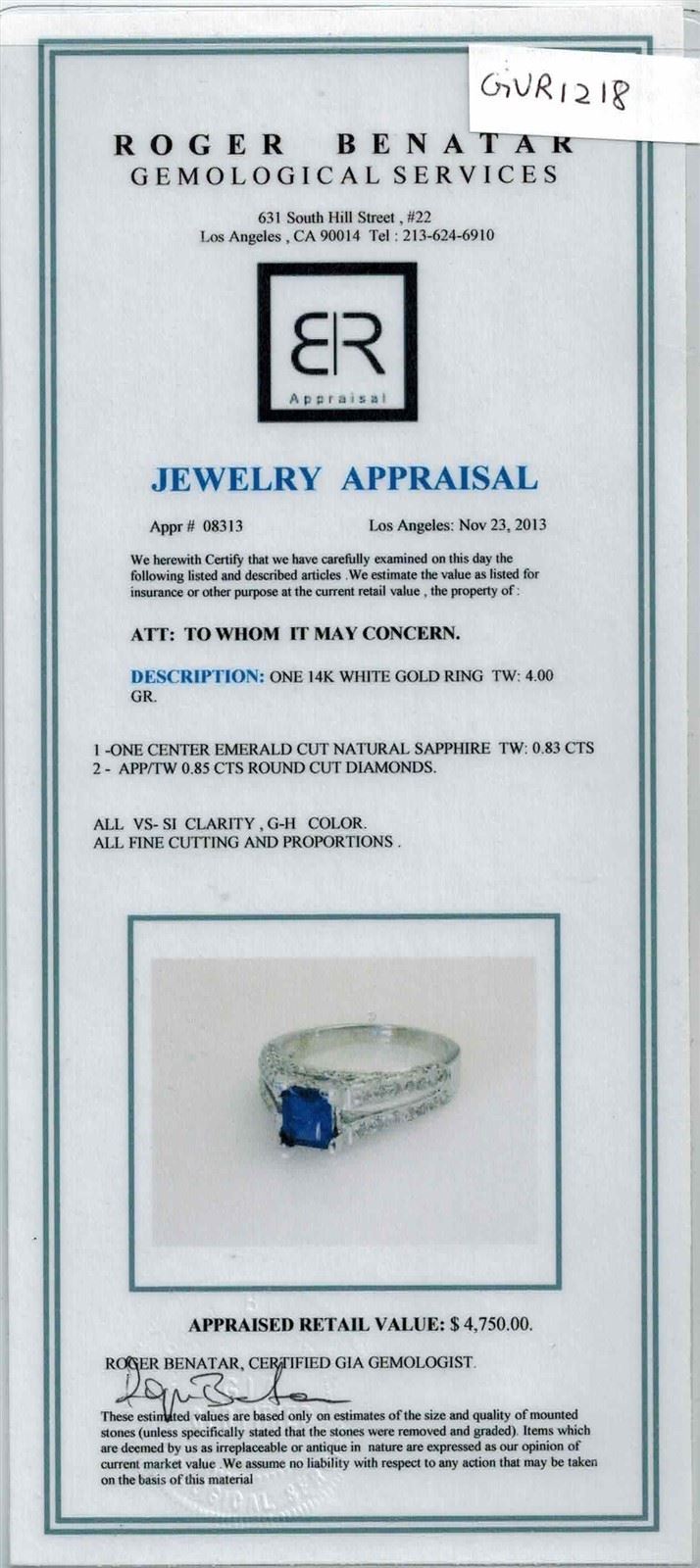 14K WHITE GOLD NATURAL CEYLON BLUE SAPHIRE RING:4.00GRAM /BLUE SAPPHIRE :0.83CT/DIAMOND RD:0.85CT /#GVR1218 **The deep azure of the 0.83ct Emerald Cut Natural Blue Sapphire, which is known to bring order and healing to the mind, is at the center of this 14kt white gold ring. Surrounded by a halo of shimmering 0.85ct round cut Diamonds, with added detail along its shank. this ring is a secure purchase; its sparkling beauty catches the eye and brightens its majestic hue.**