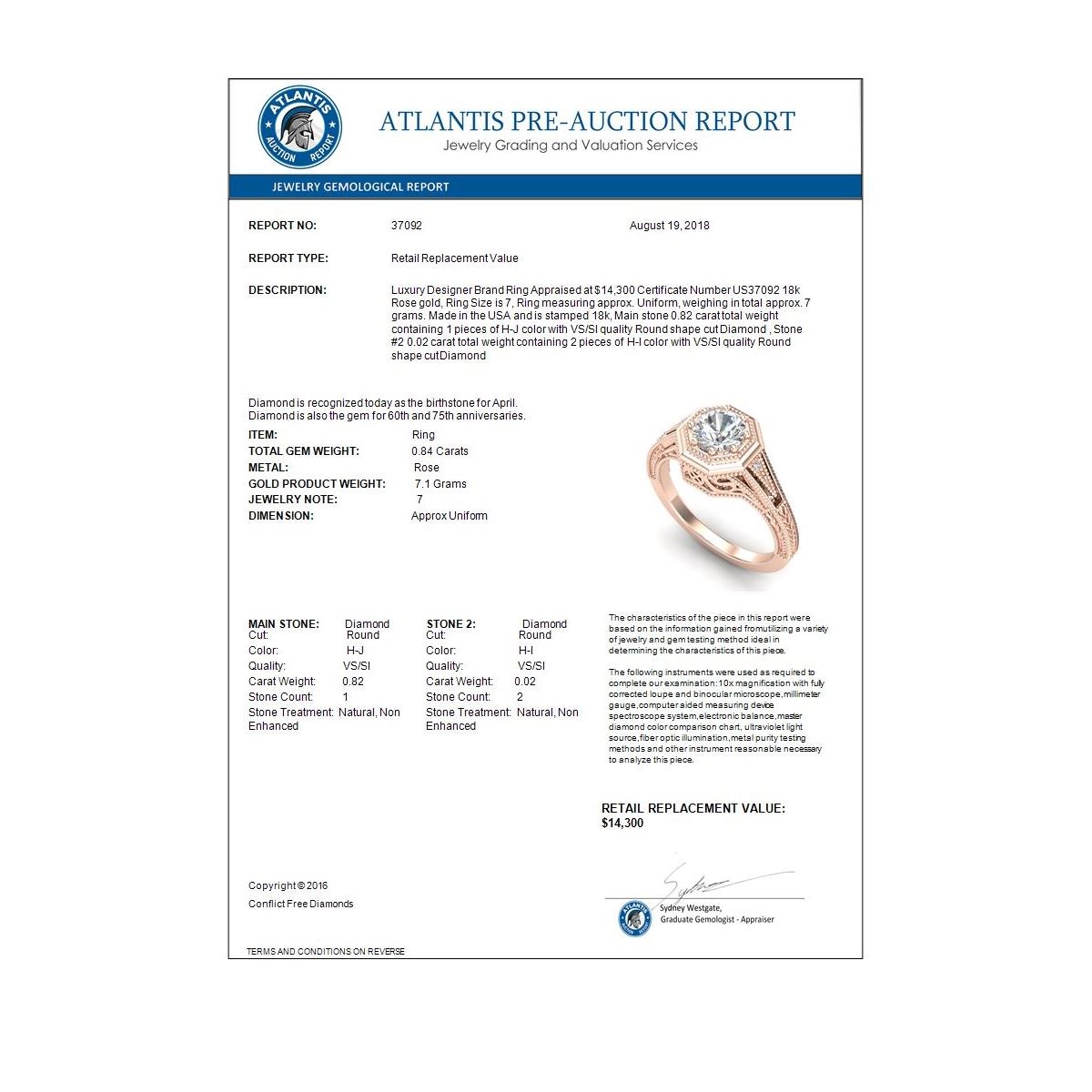REF-236Y4K -37092 ---- 0.84 CTW VS/SI Diamond Solitaire Art Deco Ring 18K Rose Gold ---- Luxury Designer Brand Ring Appraised at $14,300 Certificate Number US37092 18k Rose gold, Ring Size is 7, Ring measuring approx. Uniform, weighing in total approx. 7 grams. Made in the USA and is stamped 18k, Main stone 0.82 carat total weight containing 1 pieces of H-J color with VS/SI quality Round shape cut Diamond , Stone #2 0.02 carat total weight containing 2 pieces of H-I color with VS/SI quality Round shape cut Diamond
