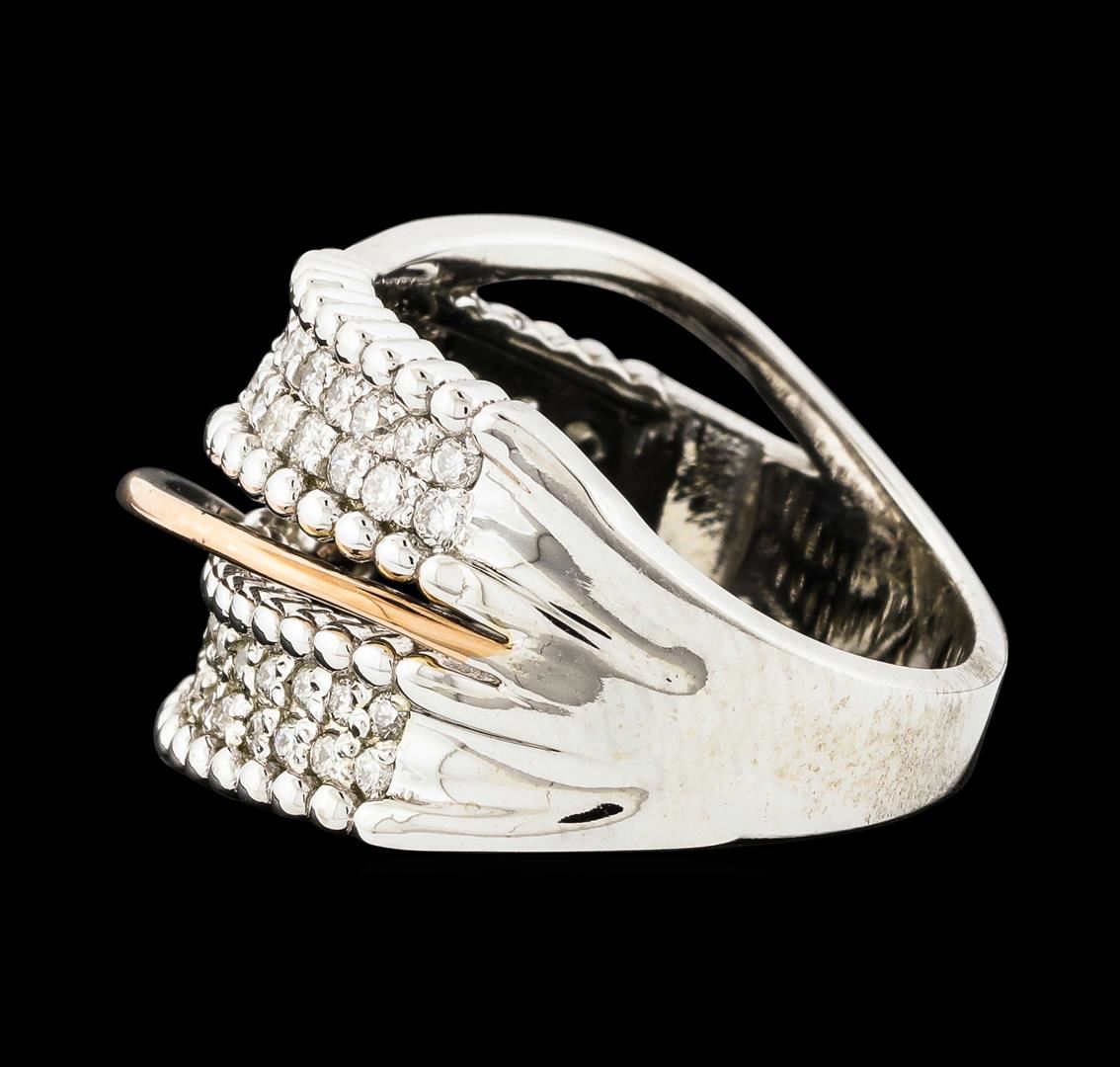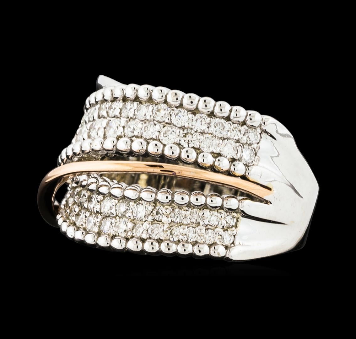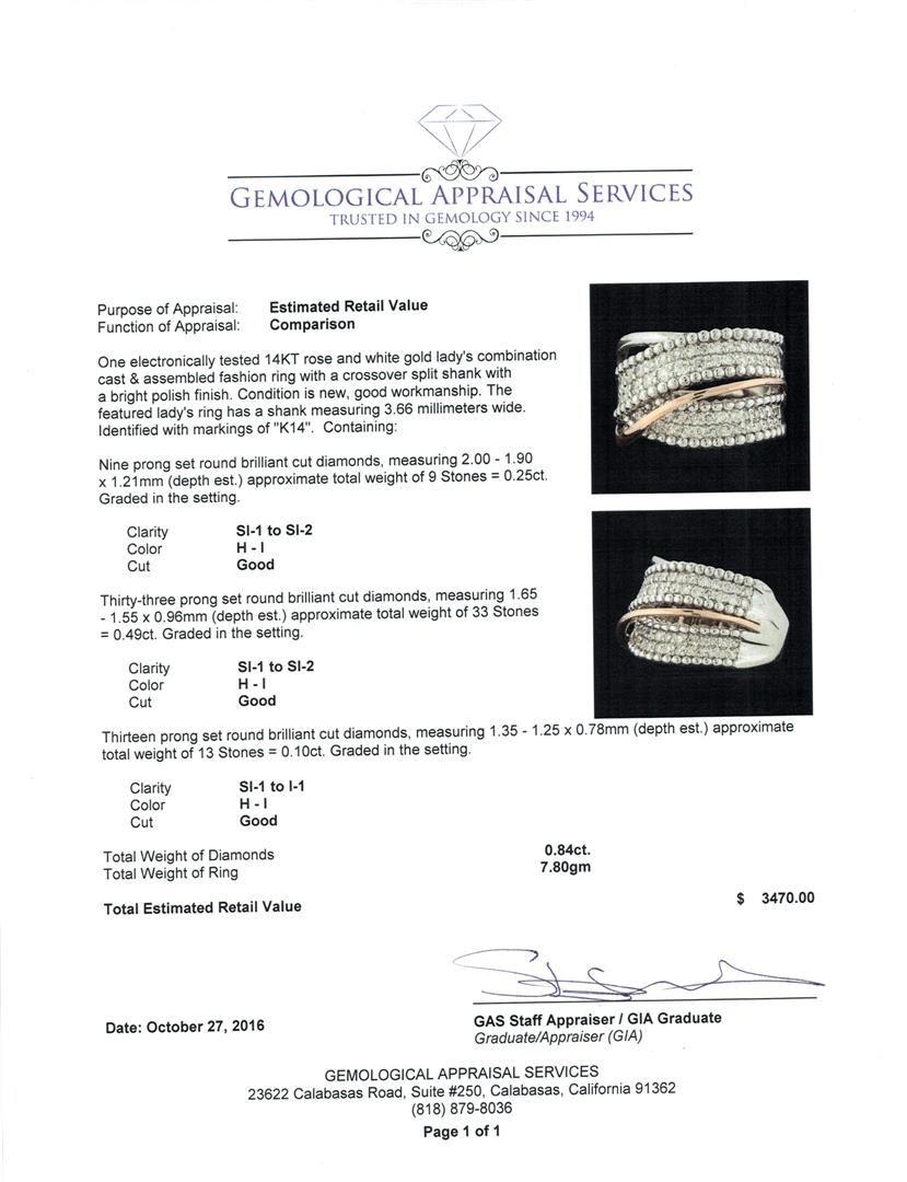 One electronically tested 14KT rose and white gold lady's combination cast & assembled fashion ring with a crossover split shank with a bright polish finish. The featured lady's ring has a shank measuring 3.66 millimeters wide. Identified with markings of 'K14'. Condition is new, good workmanship. Containing: Nine prong set round brilliant cut diamonds, measuring 2.00 - 1.90 x 1.21mm (depth est.) approximate total weight of 9 Stones = 0.25ct. Graded in the setting. Clarity SI-1 to SI-2. Color: H - I Cut Good Thirty-Three prong set round brilliant cut diamonds, measuring 1.65 - 1.55 x 0.96mm (depth est.) approximate total weight of 33 Stones = 0.49ct. Graded in the setting. Clarity SI-1 to SI-2. Color: H - I Cut Good Thirteen prong set round brilliant cut diamonds, measuring 1.35 - 1.25 x 0.78mm (depth est.) approximate total weight of 13 Stones = 0.10ct. Graded in the setting. Clarity SI-1 to I-1. Color: H - I Cut Good. Total Weight of Diamonds 0.84ct.. Total Weight of Ring 7.80gm. GAS Appraised at $3,470.00.