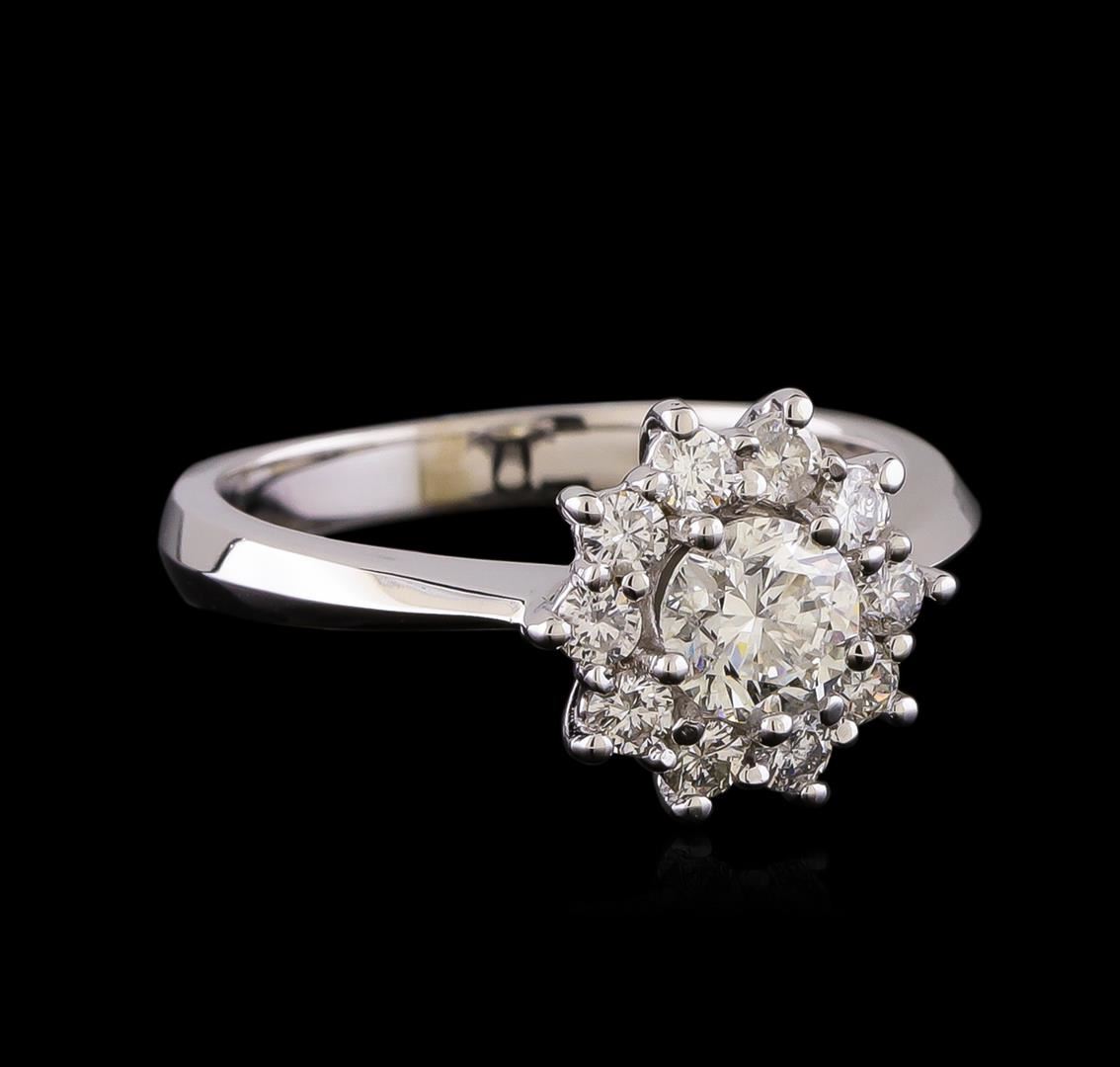 One electronically tested 14KT white gold lady's cast wedding ring with a basket halo with a bright polish finish. The featured lady's ring has a shank measuring 2.43 millimeters wide. Identified with markings of "14K". Condition is new, good workmanship. Containing: One round brilliant cut diamond, measuring 5.15 - 5.13 x 3.21mm (depth est.) approximate weight of 0.51ct. Graded in the setting. Clarity: SI-2. Color: G - Very Good Ten prong set round brilliant cut diamonds, measuring 2.10 - 2.00 x 1.27mm (depth est.) approximate total weight of 10 Stones = 0.33ct. Graded in the setting. Clarity: SI-1 to I-1. Color: G - I. Cut Very Good. Total Weight of Diamonds 0.84ct. Total Weight of Ring 3.30gm. GAS Appraised at $4,930.00.