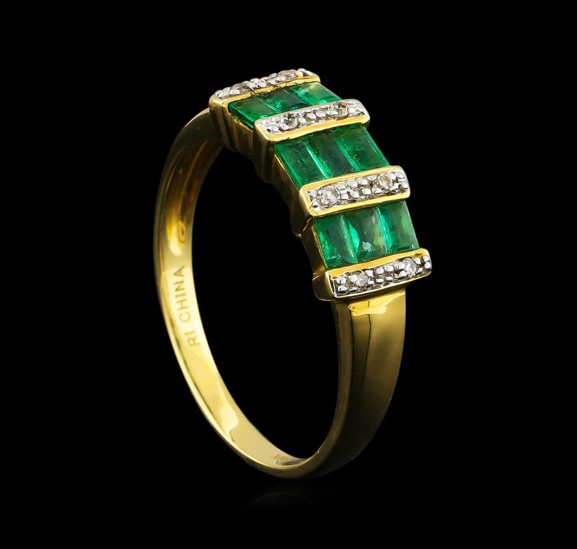 One ring featuring: 14KT yellow gold weighing 2.41 grams containing nine emeralds with a total weight of 0.84ct and eight round diamonds with a total weight of 0.06ct.