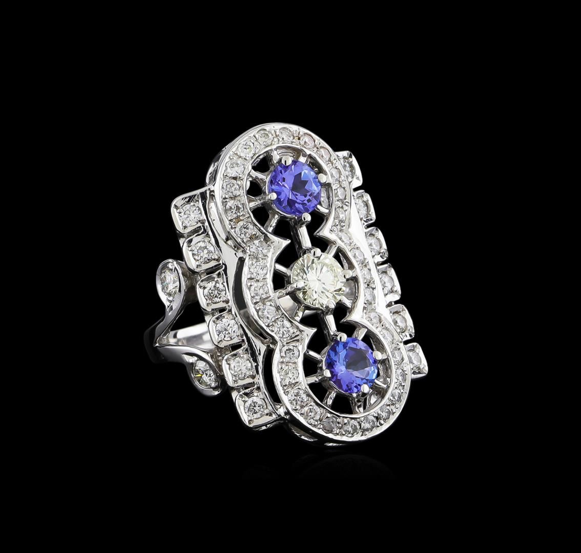 One electronically tested 14KT white gold ladies cast tanzanite and diamond ring with a bright polish finish. The ring features a tanzanite duo set within an elaborate diamond cut-out gallery supported by stylized split shoulders, completed by a two millimeter wide band. Identified with markings of "K14". Condition is new, good workmanship. Containing: Two prong set round mixed cut natural tanzanites, measuring 4.80 - 4.70 x 3.09 mm, exact total weight 0.84ct., clarity is eye clean, type I, medium, very slightly grayish, bluish violet color, (GIA bV 5/3), cut is good. Transmitting light with no distortion, transparent. Graded in the setting. Tanzanite is a very rare gemstone that is only found in the country of Tanzania. Originally discovered in 1967. Tiffany & Company, named the stone Tanzanite. It is found in the Usumburu Mountains that border the Umba Valley of northern Tanzania. Tanzanite occurs in gray, brown, violet, blue, reddish-purple, & green. The gem is interesting because of its exceptional pleochroism. Rotated in different directions a tanzanite will exhibit multiple changes of color. Tanzanite has a low tolerance to ultrasonic cleaning, and should not be cleaned using this method. One prong set round brilliant cut diamond, measuring 4.80 - 4.80 x 2.88mm exact weight 0.42ct. Graded in the setting. Clarity: SI-1. Color: M Fifty prong set round brilliant cut diamonds exact total weight 50 Stones = 1.04ct. Graded in the setting. Clarity: SI-2 to I-2. Color: G - I. Total Weight of Colored Stones 0.84ct. Total Weight of Diamonds 1.46ct. Total Weight of Ring 9.78gm. AIG Appraised at $6,650.00.