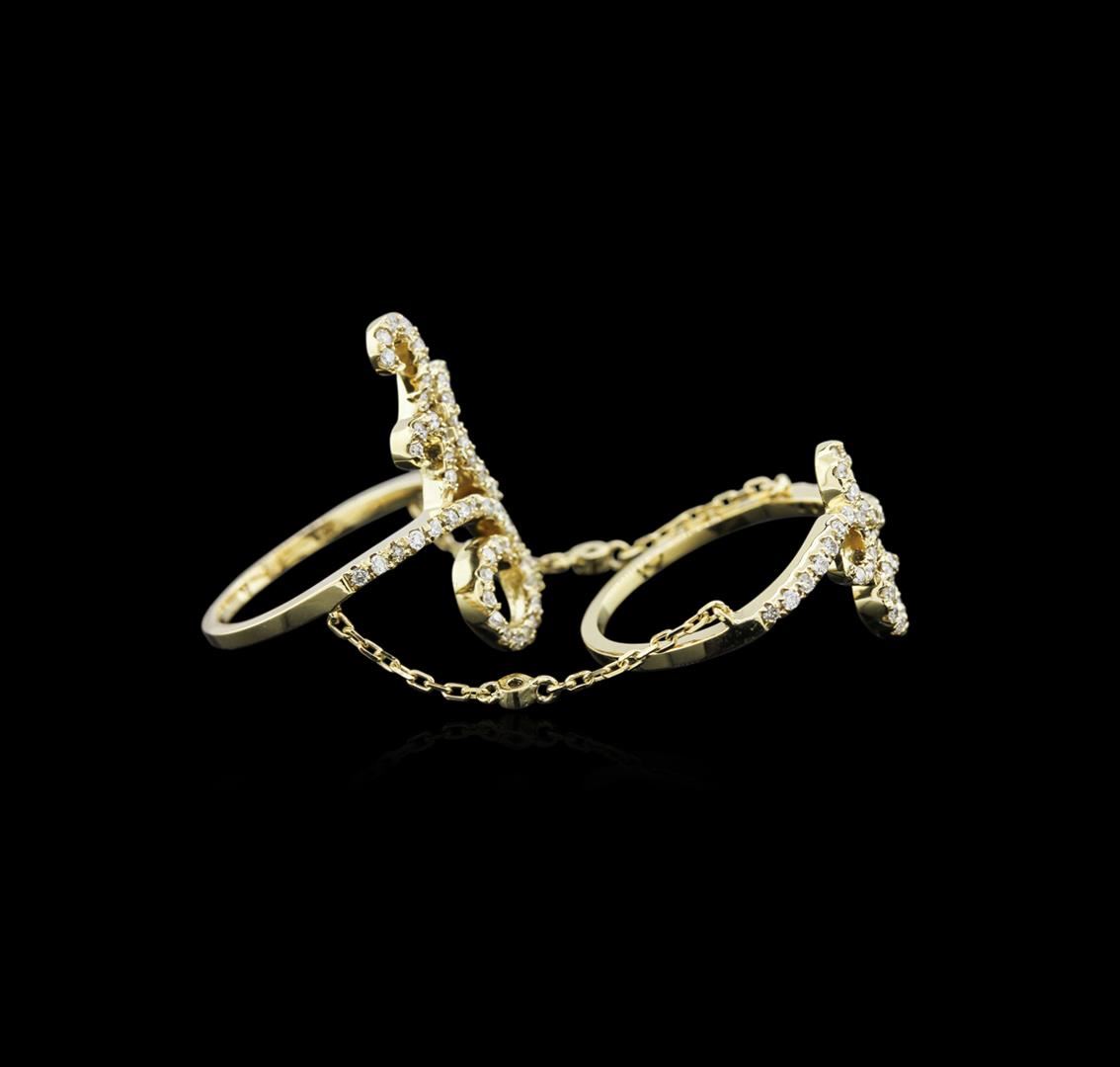 One electronically tested 14KT yellow gold ladies cast & assembled diamond knuckle ring with a bright polish finish. The knuckle ring features two ring with swirling diamond ribbons connected by two diamond accented chains. Each ring is completed by a one millimeter wide band. Condition is new, good workmanship. Containing: One Hundred Twelve prong & bezel set round brilliant cut diamonds approximate total weight of 112 Stones = 0.84ct. Graded in the setting. Clarity I-1 to I-2 Color G - I. Total Weight of Diamonds 0.84ct. Total Weight of Knuckle Ring 6.79 grams. AIG Appraised at $3,335.00.