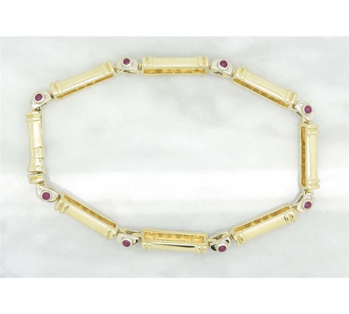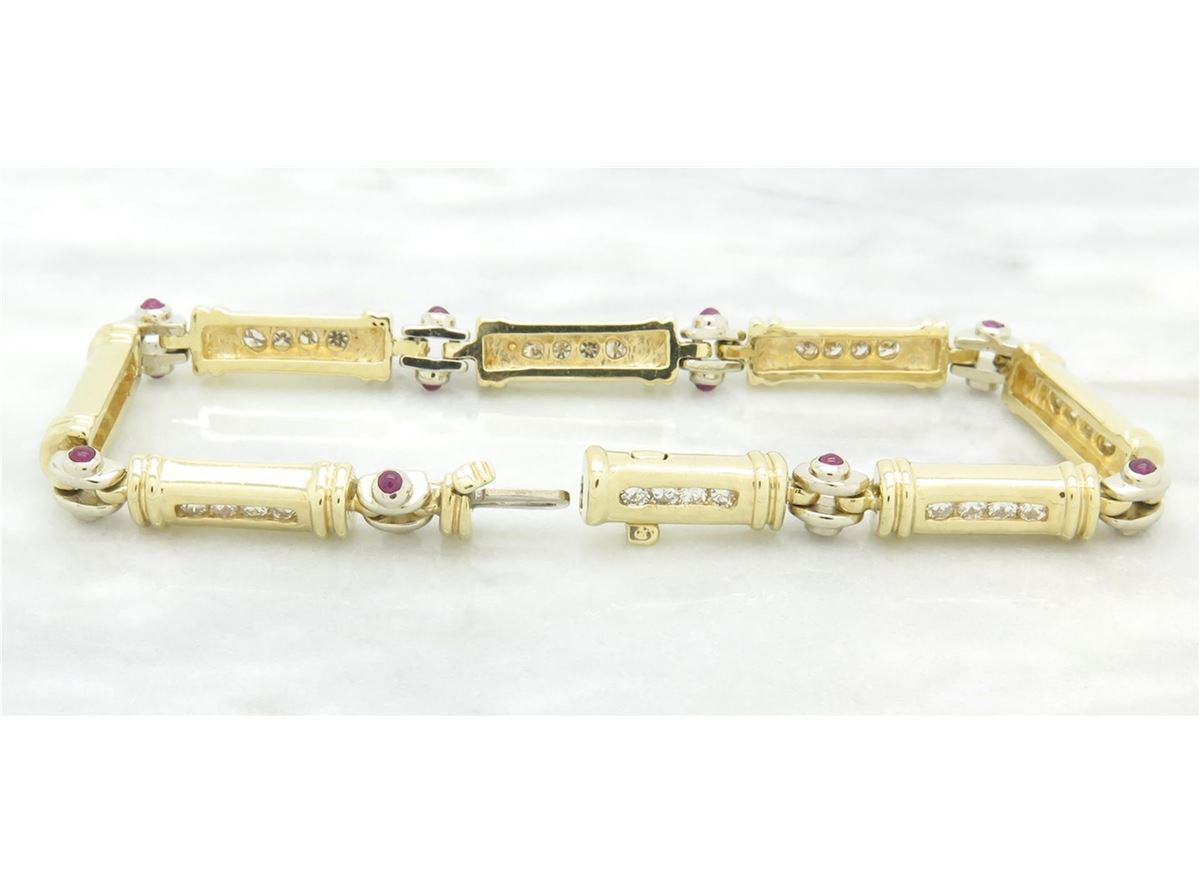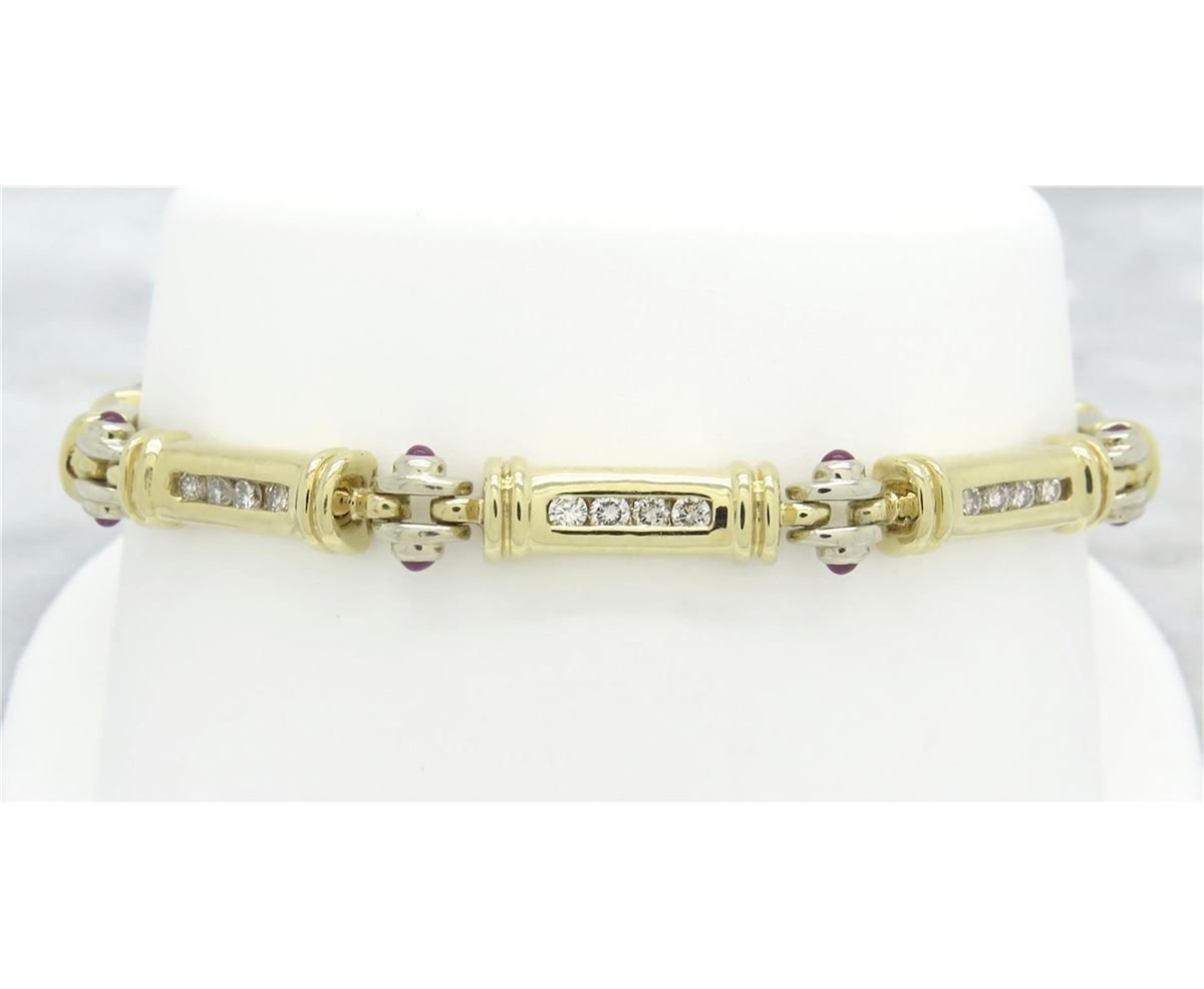 One tested 14K yellow gold diamond and ruby bracelet. Containing: 32 Round Brilliant Cut Diamonds. Clarity: I-SI, Color: H-I. Approximate total diamond weight: .84CTW. Diamonds are graded in the mounting, unless otherwise stated. 16 ruby cabochons. Approximate ruby weight: .50CTW. Weight of bracelet: 15.3 grams. Size: 7" long.