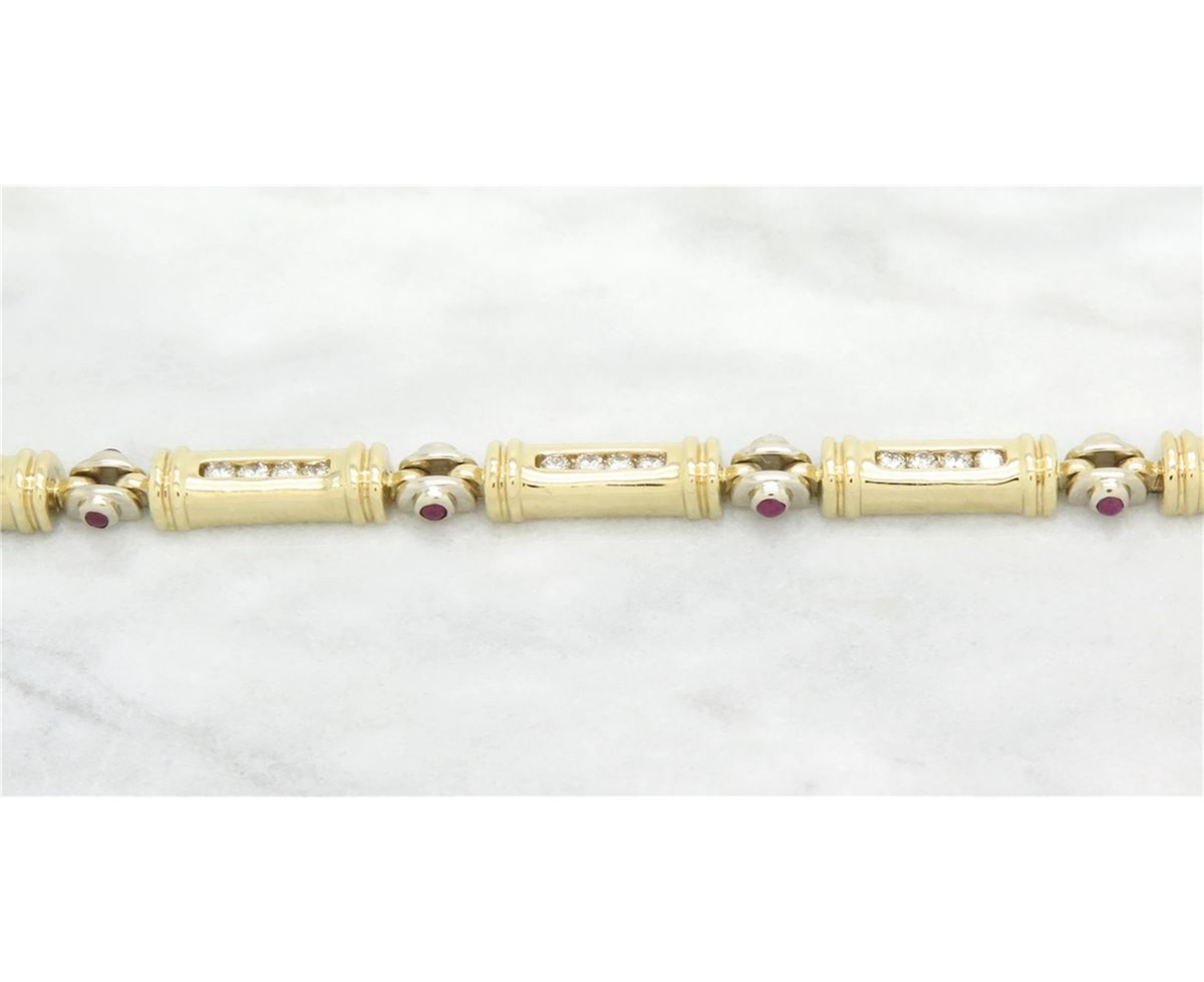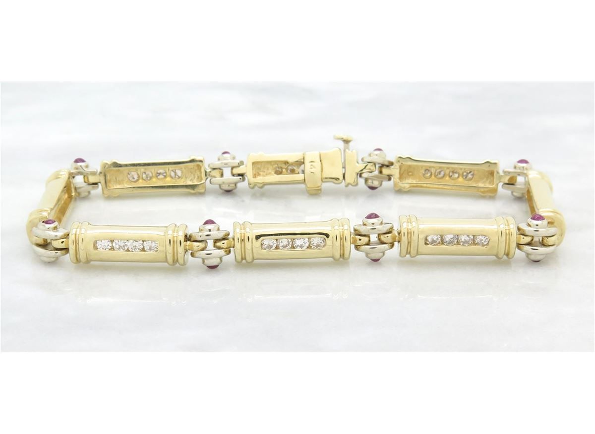 One tested 14K yellow gold diamond and ruby bracelet. Containing: 32 Round Brilliant Cut Diamonds. Clarity: I-SI, Color: H-I. Approximate total diamond weight: .84CTW. Diamonds are graded in the mounting, unless otherwise stated. 16 ruby cabochons. Approximate ruby weight: .50CTW. Weight of bracelet: 15.3 grams. Size: 7" long.