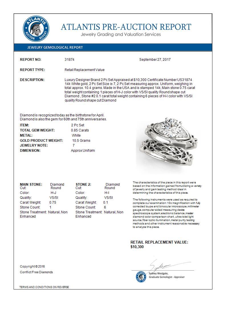 31874 - REF-208M2F ---- 0.85 CTW Certified VS/SI Diamond Solitaire 2Pc Set 14K White Gold ---- Luxury Designer Brand 2 Pc Set Appraised at $10,300 Certificate Number US31874 14k White gold, 2 Pc Set Size is 7, 2 Pc Set measuring approx. Uniform, weighing in total approx. 10.4 grams. Made in the USA and is stamped 14k, Main stone 0.75 carat total weight containing 1 pieces of H-J color with VS/SI quality Round shape cut Diamond , Stone #2 0.1 carat total weight containing 6 pieces of H-I color with VS/SI quality Round shape cut Diamond