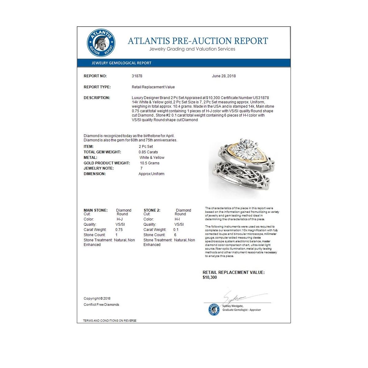 REF-208W2F -31878 ---- 0.85 CTW Certified VS/SI Diamond Solitaire 2Pc Set 14K White & Yellow Gold ---- Luxury Designer Brand 2 Pc Set Appraised at $10,300 Certificate Number US31878 14k White & Yellow gold, 2 Pc Set Size is 7, 2 Pc Set measuring approx. Uniform, weighing in total approx. 10.4 grams. Made in the USA and is stamped 14k, Main stone 0.75 carat total weight containing 1 pieces of H-J color with VS/SI quality Round shape cut Diamond , Stone #2 0.1 carat total weight containing 6 pieces of H-I color with VS/SI quality Round shape cut Diamond