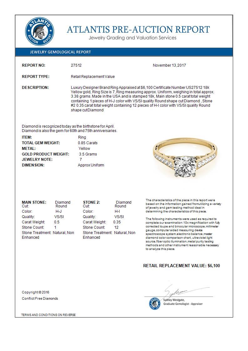 27512 - REF-110W7H ---- 0.85 CTW Certified VS/SI Diamond Solitaire Ring 18K Yellow Gold ---- Luxury Designer Brand Ring Appraised at $6,100 Certificate Number US27512  18k Yellow gold,  Ring Size is 7, Ring measuring approx. Uniform, weighing in total approx. 3.38 grams. Made in the USA and is stamped 18k, Main stone 0.5 carat total weight containing 1 pieces of H-J color with VS/SI quality Round shape cut Diamond , Stone #2 0.35 carat total weight containing 12 pieces of H-I color with  VS/SI quality Round shape cut Diamond