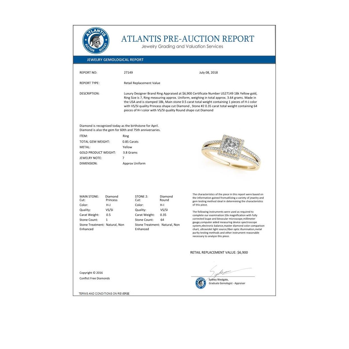 REF-139H8A -27149 ---- 0.85 CTW Certified VS/SI Princess Diamond Solitaire Halo Ring 18K Yellow Gold ---- Luxury Designer Brand Ring Appraised at $6,900 Certificate Number US27149 18k Yellow gold, Ring Size is 7, Ring measuring approx. Uniform, weighing in total approx. 3.64 grams. Made in the USA and is stamped 18k, Main stone 0.5 carat total weight containing 1 pieces of H-J color with VS/SI quality Princess shape cut Diamond , Stone #2 0.35 carat total weight containing 64 pieces of H-I color with VS/SI quality Round shape cut Diamond