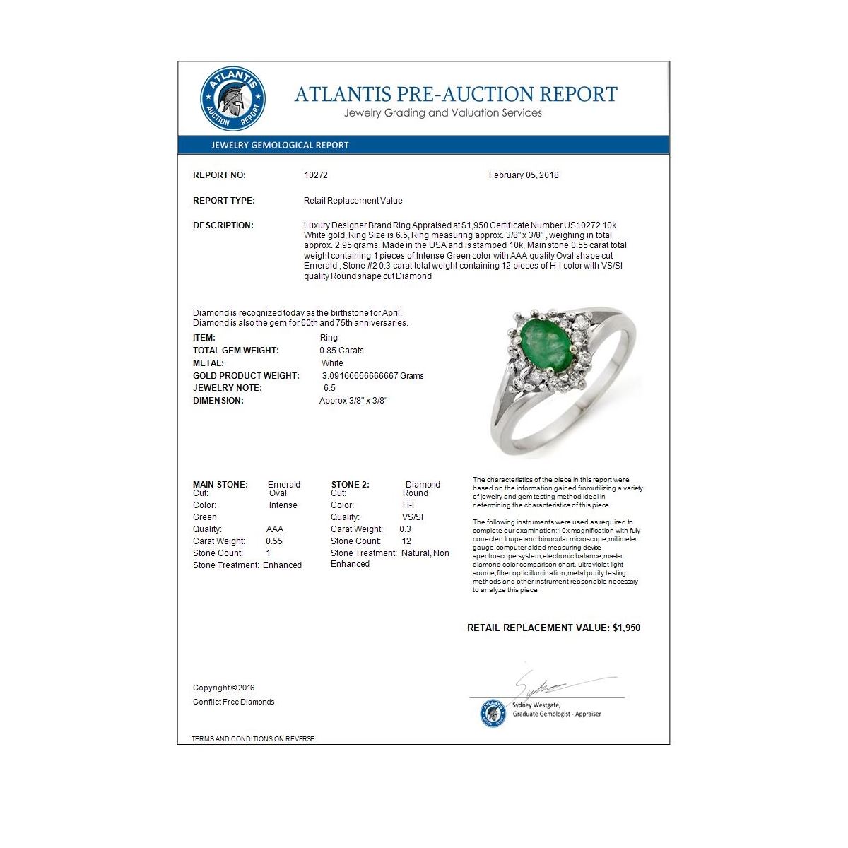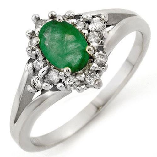 REF-29K6W -10272 ---- 0.85 CTW Emerald & Diamond Ring 10K White Gold ---- Luxury Designer Brand Ring Appraised at $1,950 Certificate Number US10272 10k White gold, Ring Size is 6.5, Ring measuring approx. 3/8" x 3/8" , weighing in total approx. 2.95 grams. Made in the USA and is stamped 10k, Main stone 0.55 carat total weight containing 1 pieces of Intense Green color with AAA quality Oval shape cut Emerald , Stone #2 0.3 carat total weight containing 12 pieces of H-I color with VS/SI quality Round shape cut Diamond