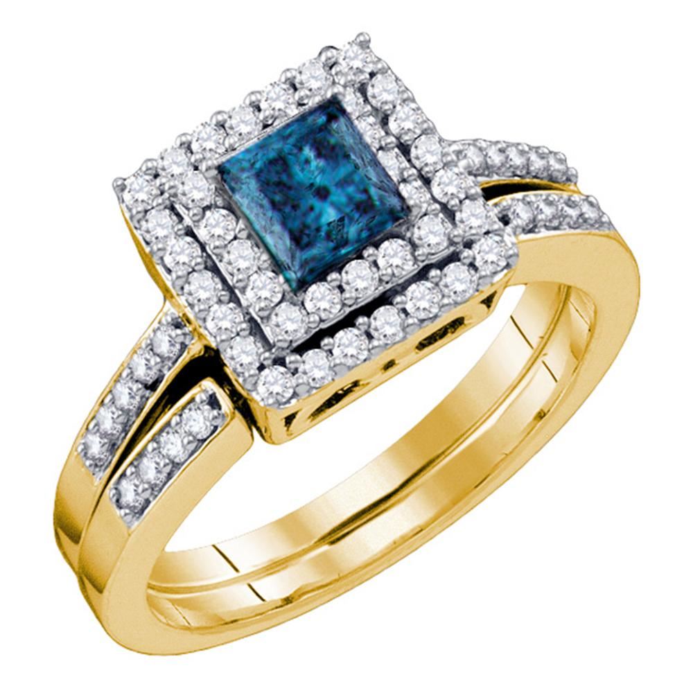 REF-89M9H- SKU: GD67021 ---- 0.85 CTW Princess Blue Color Diamond Square Halo Bridal Ring 14KT Yellow Gold