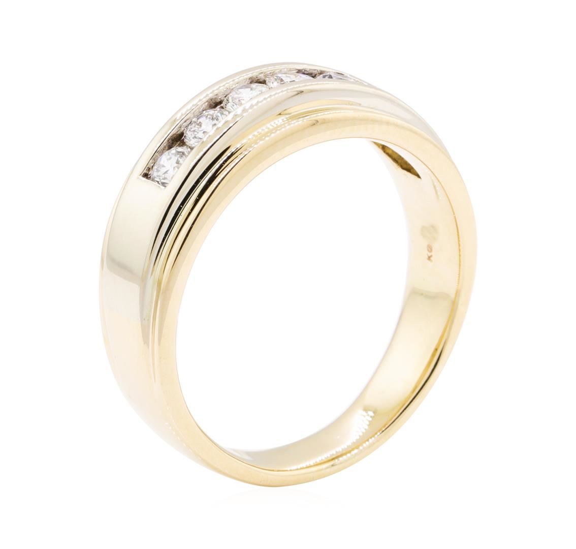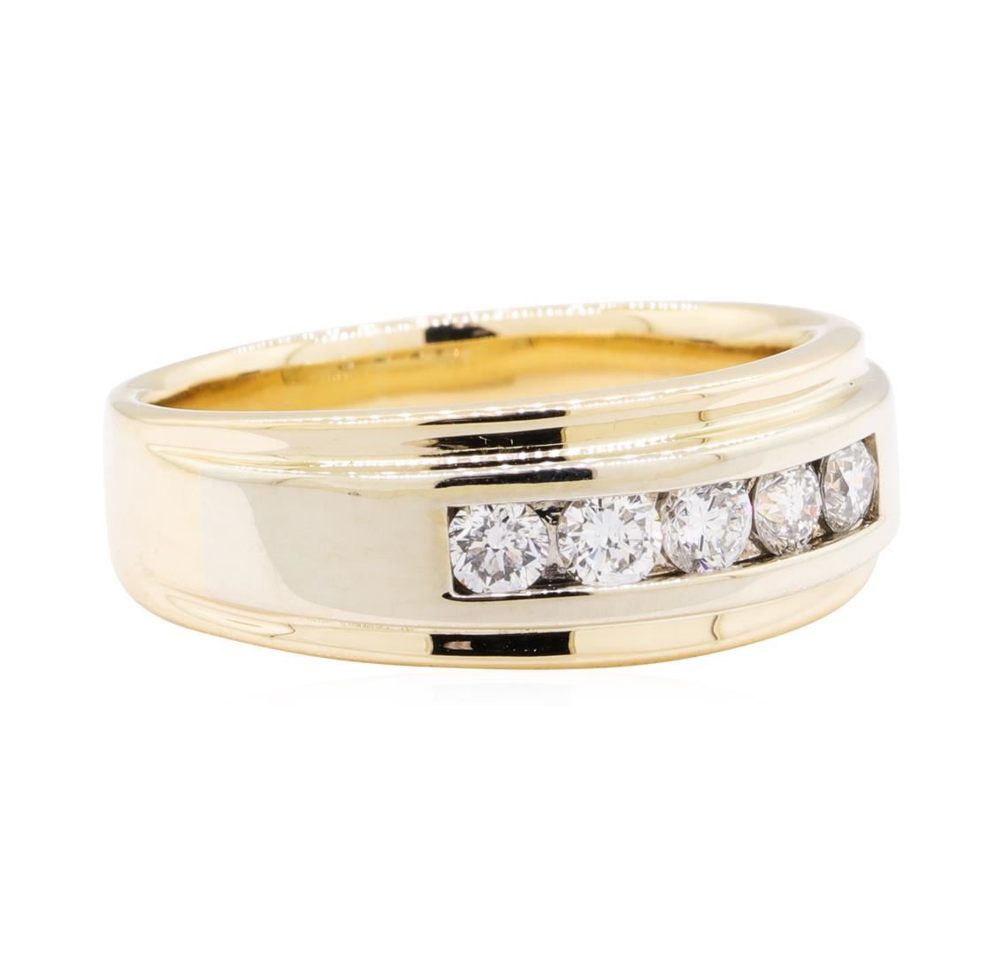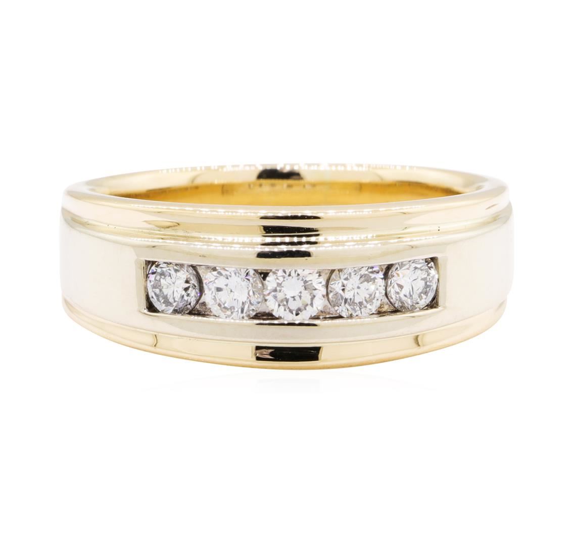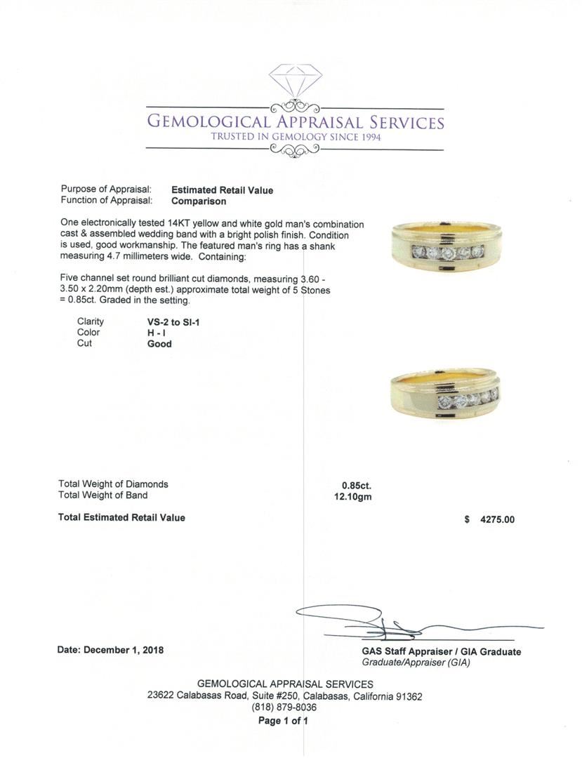 One electronically tested 14KT yellow and white gold man's combination cast & assembled wedding band with a bright polish finish. The featured man's ring has a shank measuring 4.7 millimeters wide. Condition is used, good workmanship. Containing: Five channel set round brilliant cut diamonds, measuring 3.60 - 3.50 x 2.20mm (depth est.) approximate total weight of 5 Stones = 0.85ct. Graded in the setting. Color H - I Clarity VS-2 to SI-1 Cut Good. Total Weight of Diamonds 0.85ct.. Total Weight of Band 12.10gm GAS Appraised at $4275.00. GAS Appraised at $4,275.00.