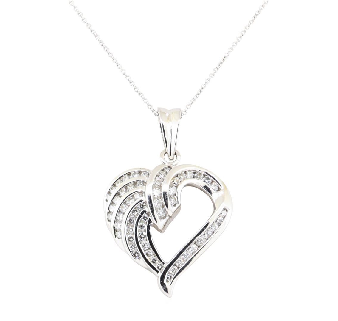 One heart shaped pendant with chain featuring: 14KT white gold weighing 5.6 grams containing diamonds weighing 0.85ctw. The chain is a 1mm rounded cable link chain measuring sixteen inches in length.