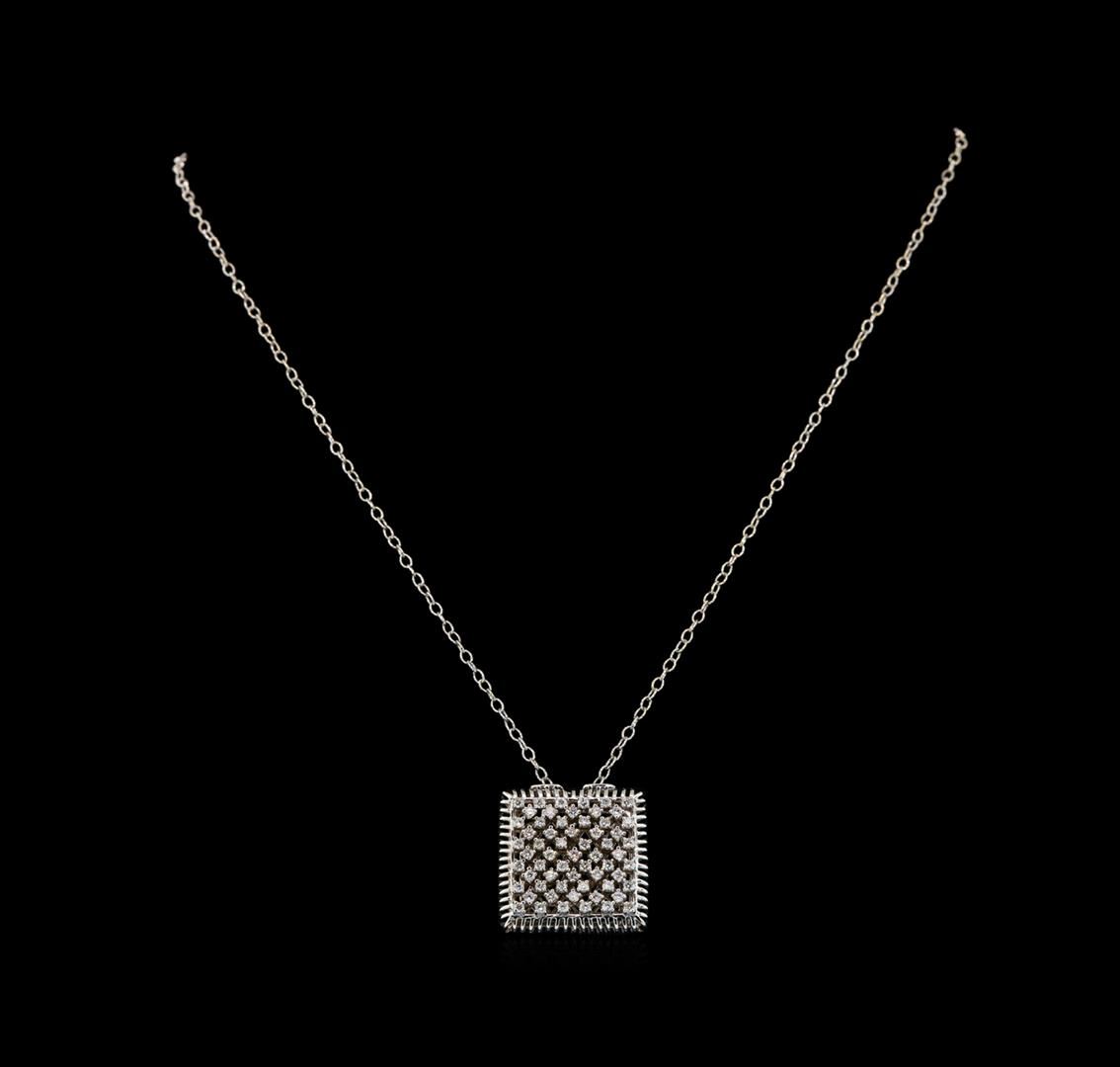One electronically tested 14KT white gold lady's combination cast & assembled fashion pendant & chain 18.0' long, 2mm twisted oval cable link with a lobster claw clasp with a bright polish finish. The featured lady's pendant has a square motif measuring 23 by 23 millimeters. Identified with markings of '585'. Condition is new, good workmanship. Containing: Sixty-One prong set round brilliant cut diamonds, measuring 1.60 - 1.50 x 0.96mm (depth est.) approximate total weight of 61 Stones = 0.85ct. Graded in the setting. Clarity SI-1 to SI-2. Color: H - I Cut Good. Total Weight of Diamonds 0.85ct.. Total Weight of Pendant & Chain 9.70gm. GAS Appraised at $3,955.00.