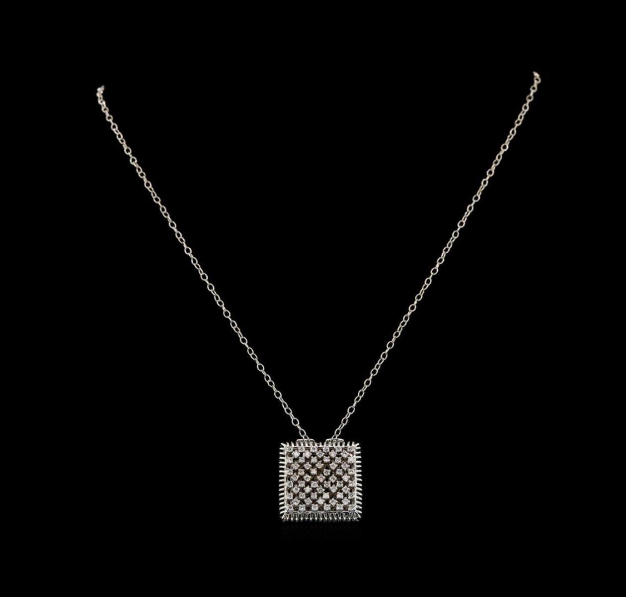 One electronically tested 14KT white gold lady's combination cast & assembled fashion pendant & chain 18.0' long, 2mm twisted oval cable link with a lobster claw clasp with a bright polish finish. The featured lady's pendant has a square motif measuring 23 by 23 millimeters. Identified with markings of '585'. Condition is new, good workmanship. Containing: Sixty-One prong set round brilliant cut diamonds, measuring 1.60 - 1.50 x 0.96mm (depth est.) approximate total weight of 61 Stones = 0.85ct. Graded in the setting. Clarity SI-1 to SI-2. Color: H - I Cut Good. Total Weight of Diamonds 0.85ct.. Total Weight of Pendant & Chain 9.70gm. GAS Appraised.