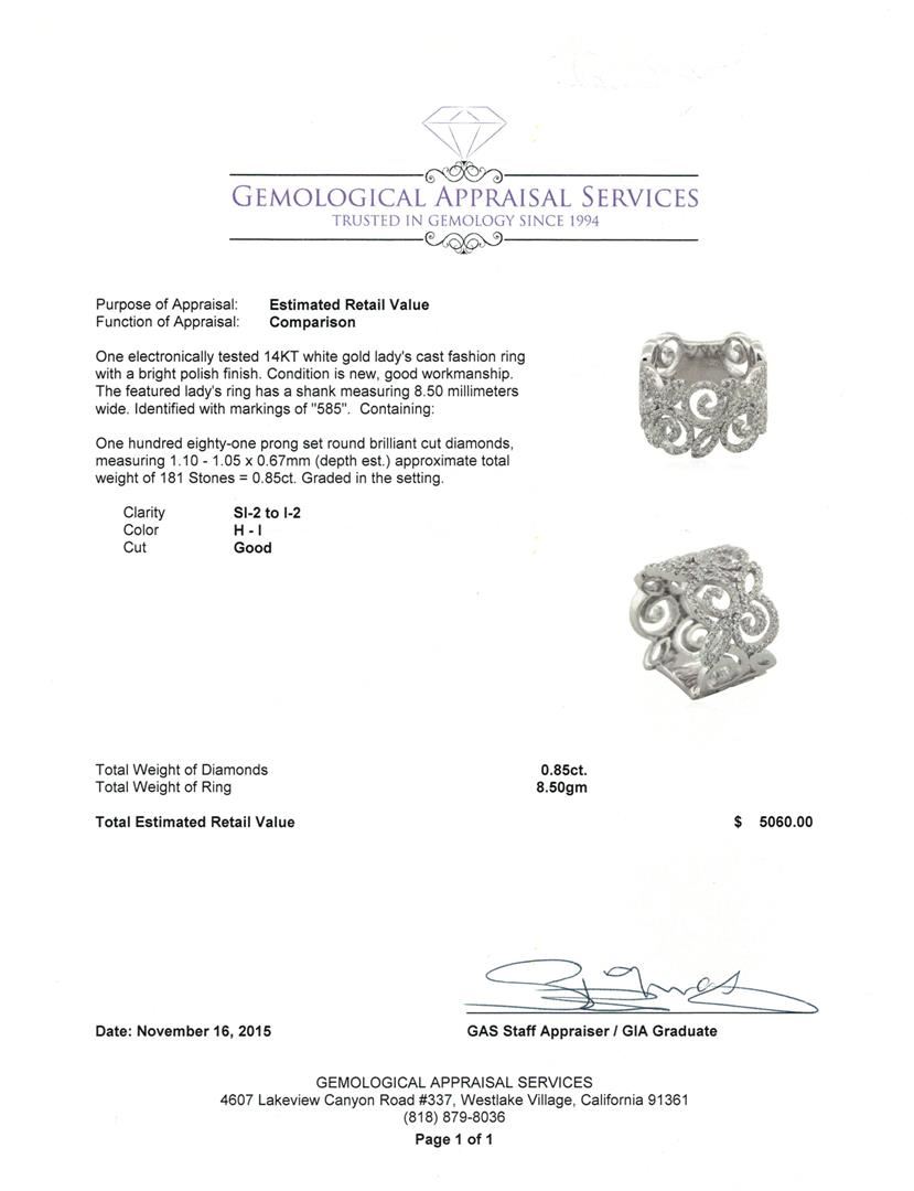 One electronically tested 14KT white gold lady's cast fashion ring with a bright polish finish. The featured lady's ring has a shank measuring 8.50 millimeters wide. Identified with markings of "585". Condition is new, good workmanship. Containing: One Hundred Eighty-One prong set round brilliant cut diamonds, measuring 1.10 - 1.05 x 0.67mm (depth est.) approximate total weight of 181 Stones = 0.85ct. Graded in the setting. Clarity: SI-2 to I-2. Color: H - I. Cut Good. Total Weight of Diamonds 0.85ct. Total Weight of Ring 8.50gm. GAS Appraised at $5,060.00.