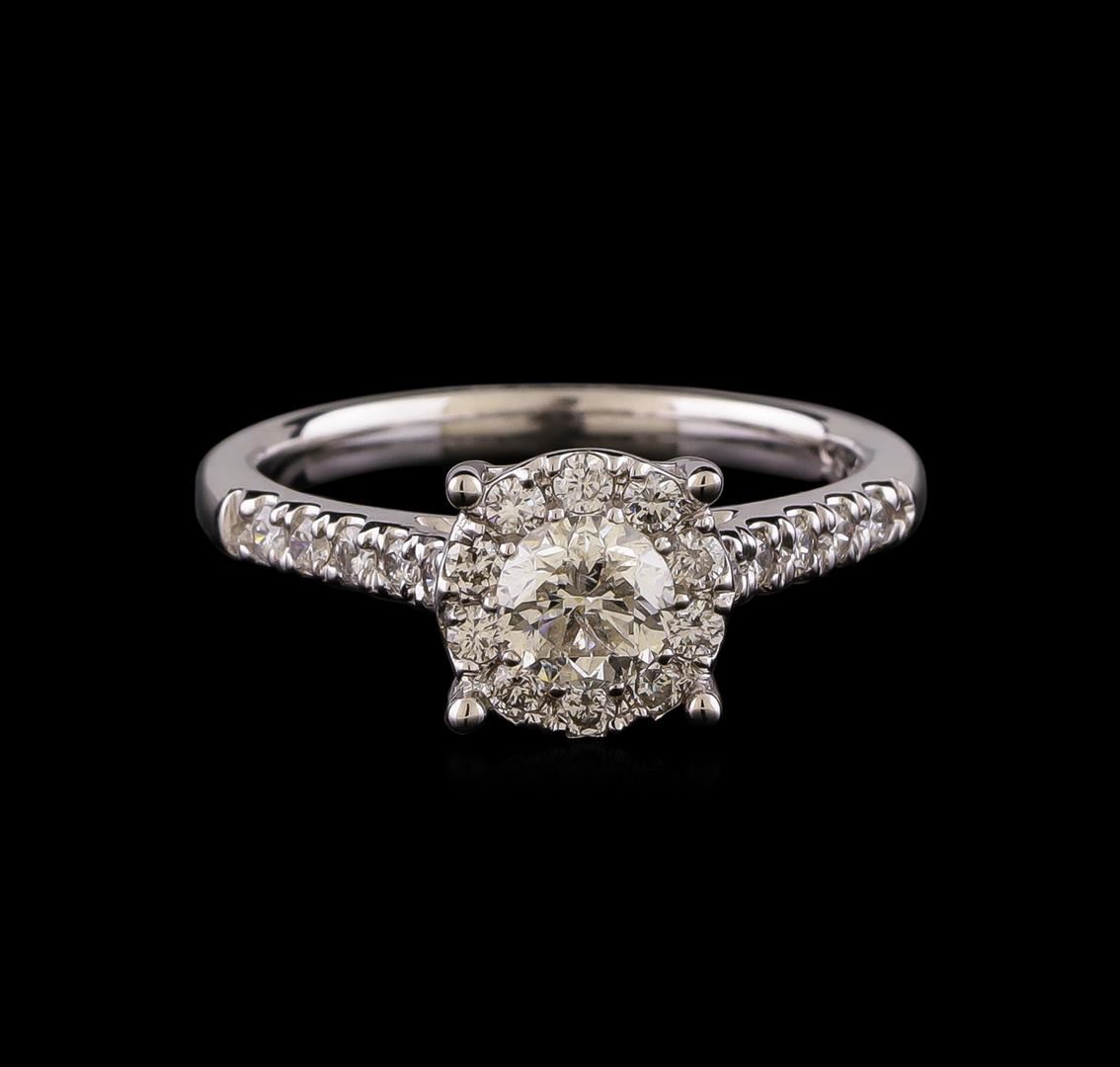 One electronically tested 14KT white gold lady's cast wedding ring with a halo with a bright polish finish. The featured lady's ring has a shank measuring 2.15 millimeters wide. Identified with markings of '585'. Condition is new, good workmanship. Containing: One prong set round brilliant cut diamond, measuring 5.15 - 5.09 x 3.12mm (depth est.) approximate weight of 0.50ct. Graded in the setting. Clarity SI-2. Color: G - H Cut Very Good Twenty prong set round brilliant cut diamonds, measuring 1.70 - 1.65 x 1.02mm (depth est.) approximate total weight of 20 Stones = 0.35ct. Graded in the setting. Clarity SI-1 to SI-2. Color: G - I Cut Good. Total Weight of Diamonds 0.85ct.. Total Weight of Ring 3.30gm. GAS Appraised at $5,140.00.