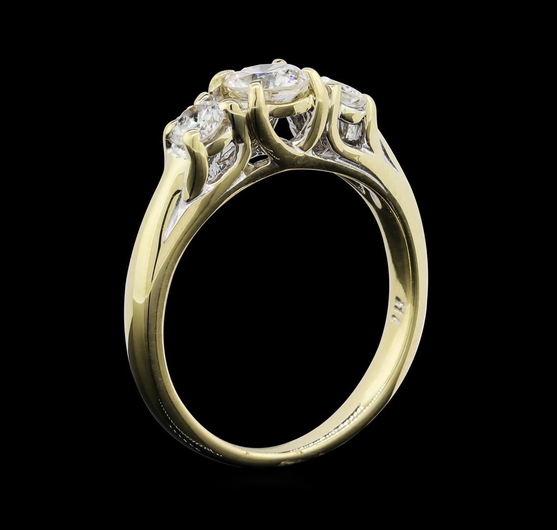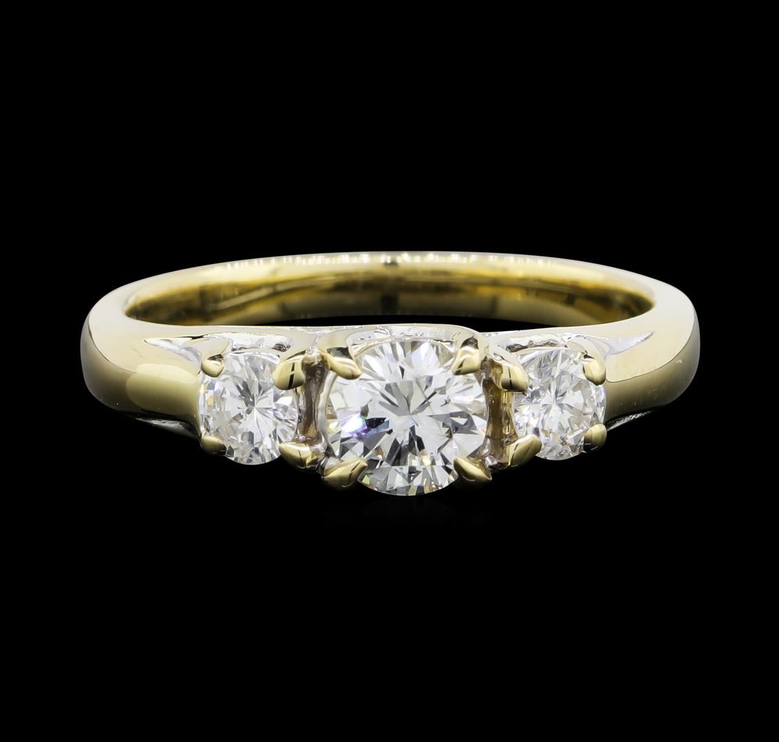 One electronically tested 14KT yellow gold lady's cast 3-stone wedding ring with a cathedral shank with a bright polish finish. The featured lady's ring has a shank measuring 2.16 millimeters wide. Identified with markings of '14K'. Condition is new, good workmanship. Containing: One prong set round brilliant cut diamond, measuring 5.16 - 5.14 x 3.20mm (depth est.) approximate weight of 0.51ct. Graded in the setting. Clarity SI-2. Color: H Cut Good Two prong set round brilliant cut diamonds, measuring 3.60 - 3.58 x 2.15mm (depth est.) approximate total weight of 2 Stones = 0.34ct. Graded in the setting. Clarity SI-2 to I-1. Color: G - H Cut Good. Total Weight of Diamonds 0.85ct.. Total Weight of Ring 4.20gm. GAS Appraised at $5,090.00.