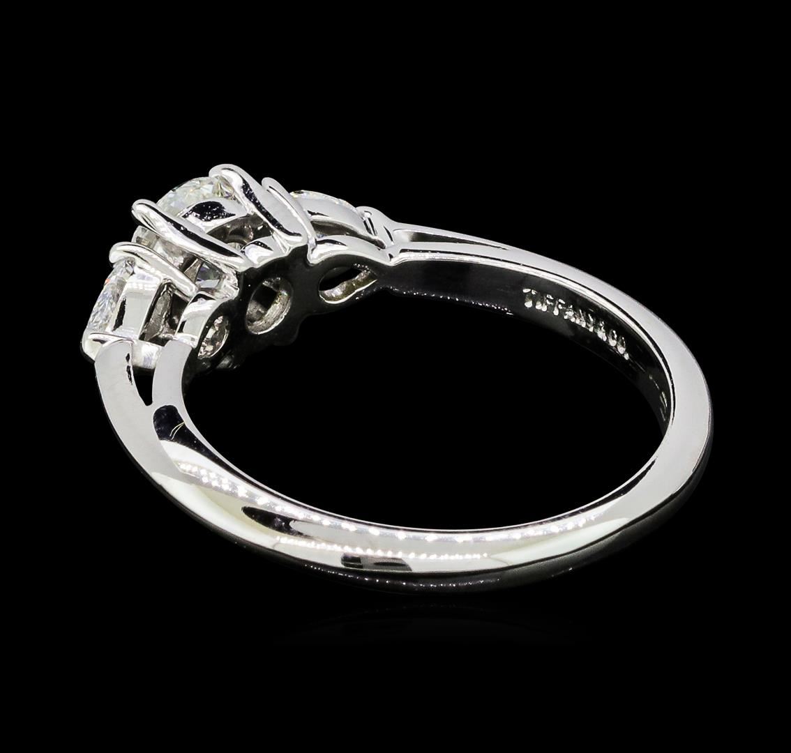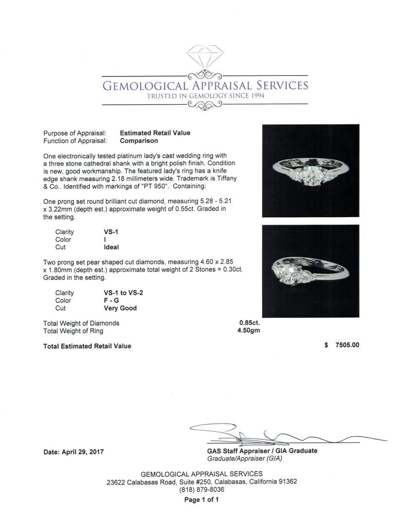 One electronically tested platinum lady's cast wedding ring with a three stone cathedral shank with a bright polish finish. The featured lady's ring has a knife edge shank measuring 2.18 millimeters wide. Trademark is Tiffany & Co. Identified with markings of 'PT 950'. Condition is new, good workmanship. Containing: One prong set round brilliant cut diamond, measuring 5.28 - 5.21 x 3.22mm (depth est.) approximate weight of 0.55ct. Graded in the setting. Color I Clarity VS-1 Cut Ideal Two prong set pear shaped cut diamonds, measuring 4.60 x 2.85 x 1.80mm (depth est.) approximate total weight of 2 Stones = 0.30ct. Graded in the setting. Color F - G Clarity VS-1 to VS-2 Cut Very Good. Total Weight of Diamonds 0.85ct.. Total Weight of Ring 4.50gm GAS Appraised at $7505.00. GAS Appraised at $7,505.00.