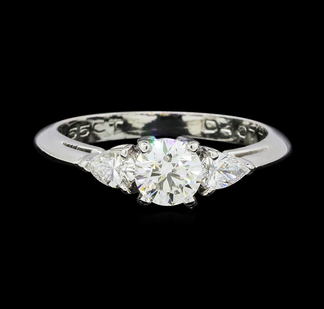 One electronically tested platinum lady's cast wedding ring with a three stone cathedral shank with a bright polish finish. The featured lady's ring has a knife edge shank measuring 2.18 millimeters wide. Trademark is Tiffany & Co. Identified with markings of 'PT 950'. Condition is new, good workmanship. Containing: One prong set round brilliant cut diamond, measuring 5.28 - 5.21 x 3.22mm (depth est.) approximate weight of 0.55ct. Graded in the setting. Color I Clarity VS-1 Cut Ideal Two prong set pear shaped cut diamonds, measuring 4.60 x 2.85 x 1.80mm (depth est.) approximate total weight of 2 Stones = 0.30ct. Graded in the setting. Color F - G Clarity VS-1 to VS-2 Cut Very Good. Total Weight of Diamonds 0.85ct.. Total Weight of Ring 4.50gm GAS Appraised at $7505.00. GAS Appraised at $7,505.00.